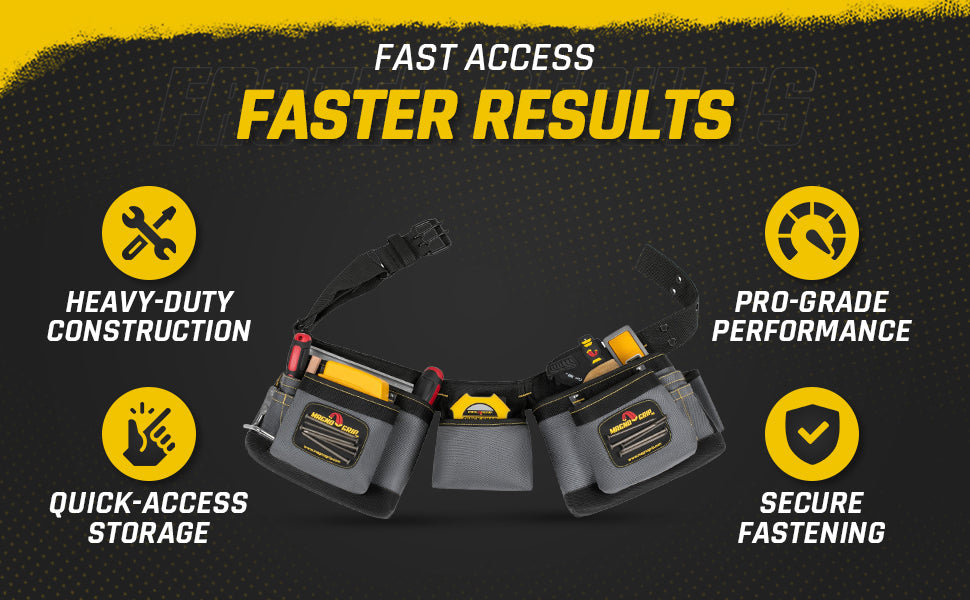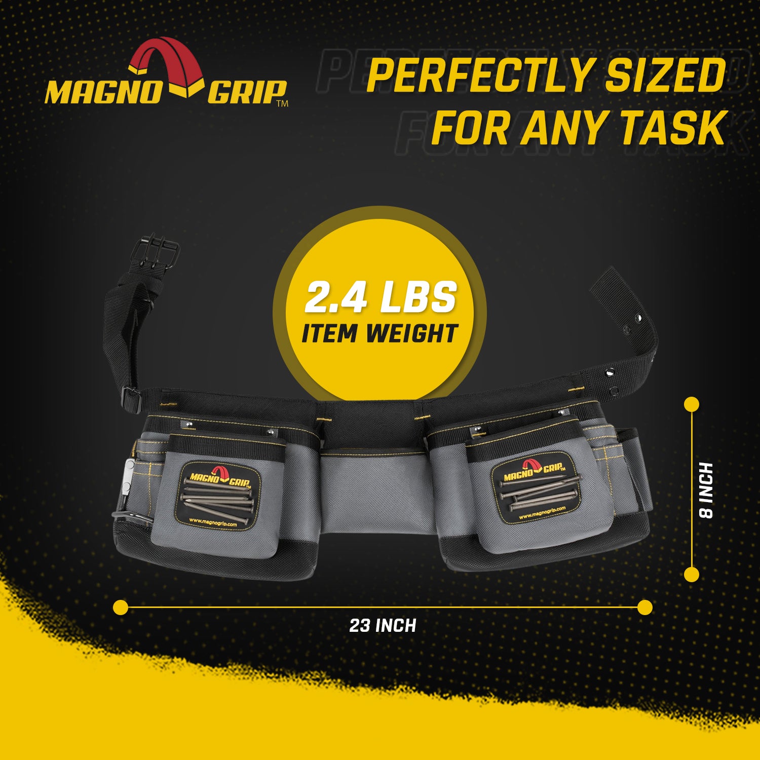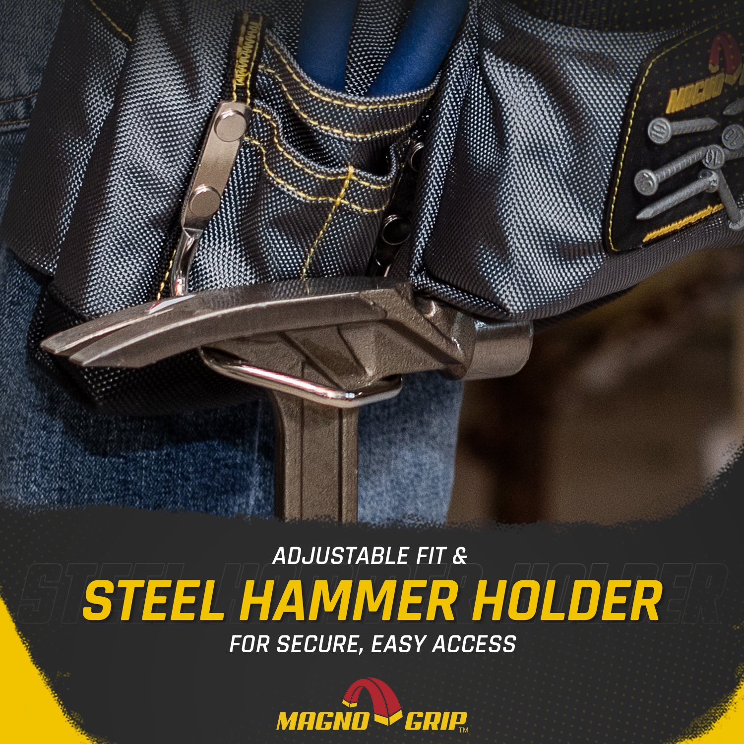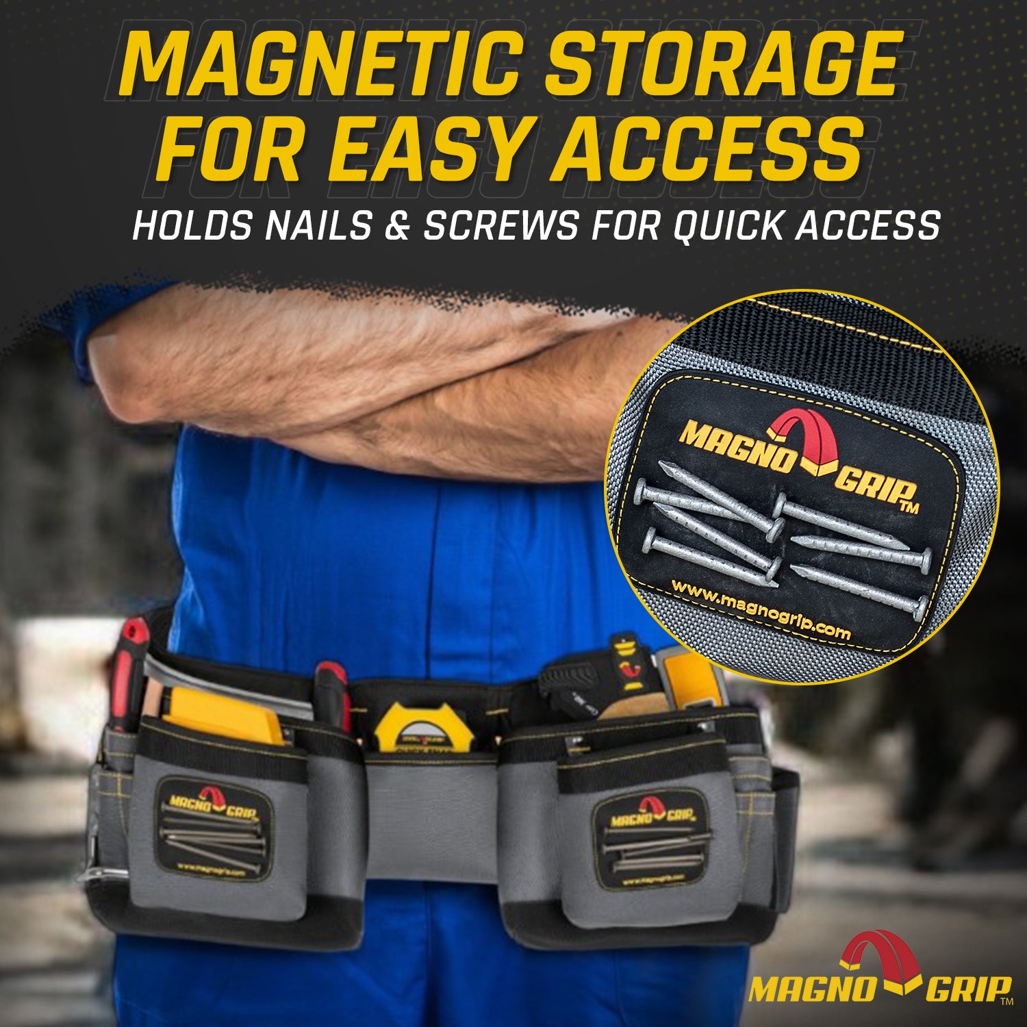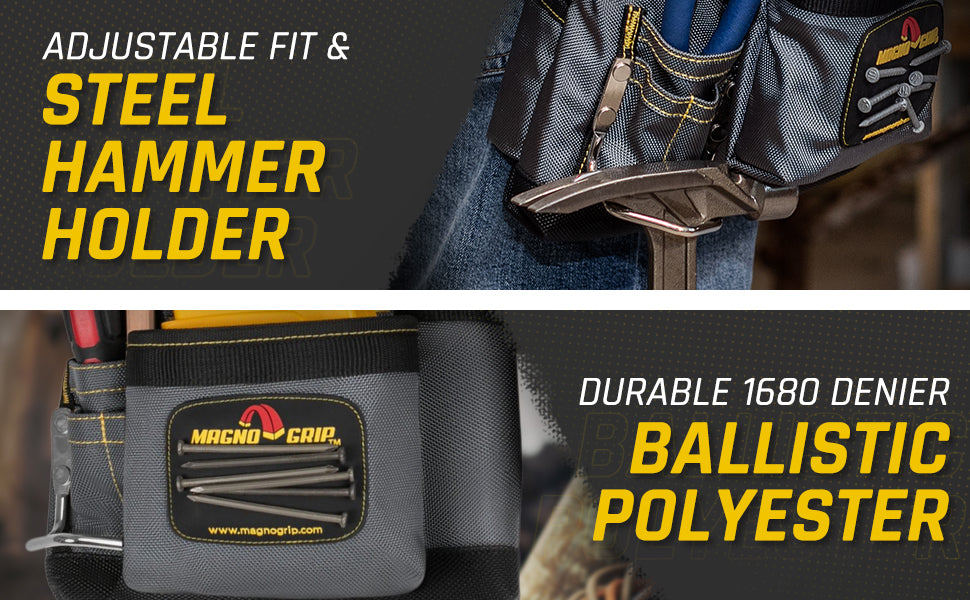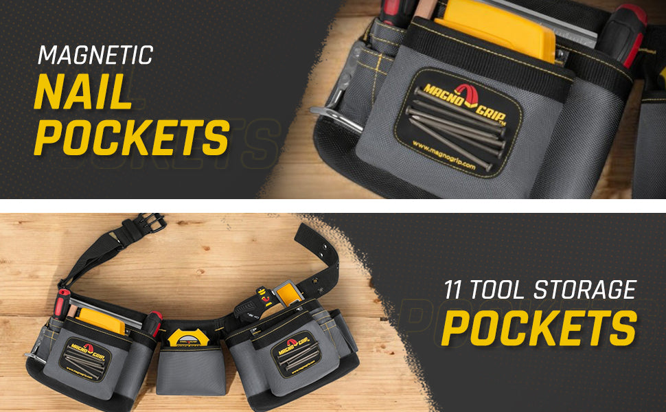 Use the MagnoGrip Magnetic Carpenter’s Tool Belt to keep your hammer secure and your tools within reach while you work. Featuring our innovative magnetic pockets which reduces annoying nail spills and allows you to store tools on the outside of the pocket. With the magnetic carpenter’s tool belt around your waist you are guaranteed to finish jobs in less time and with less frustration.