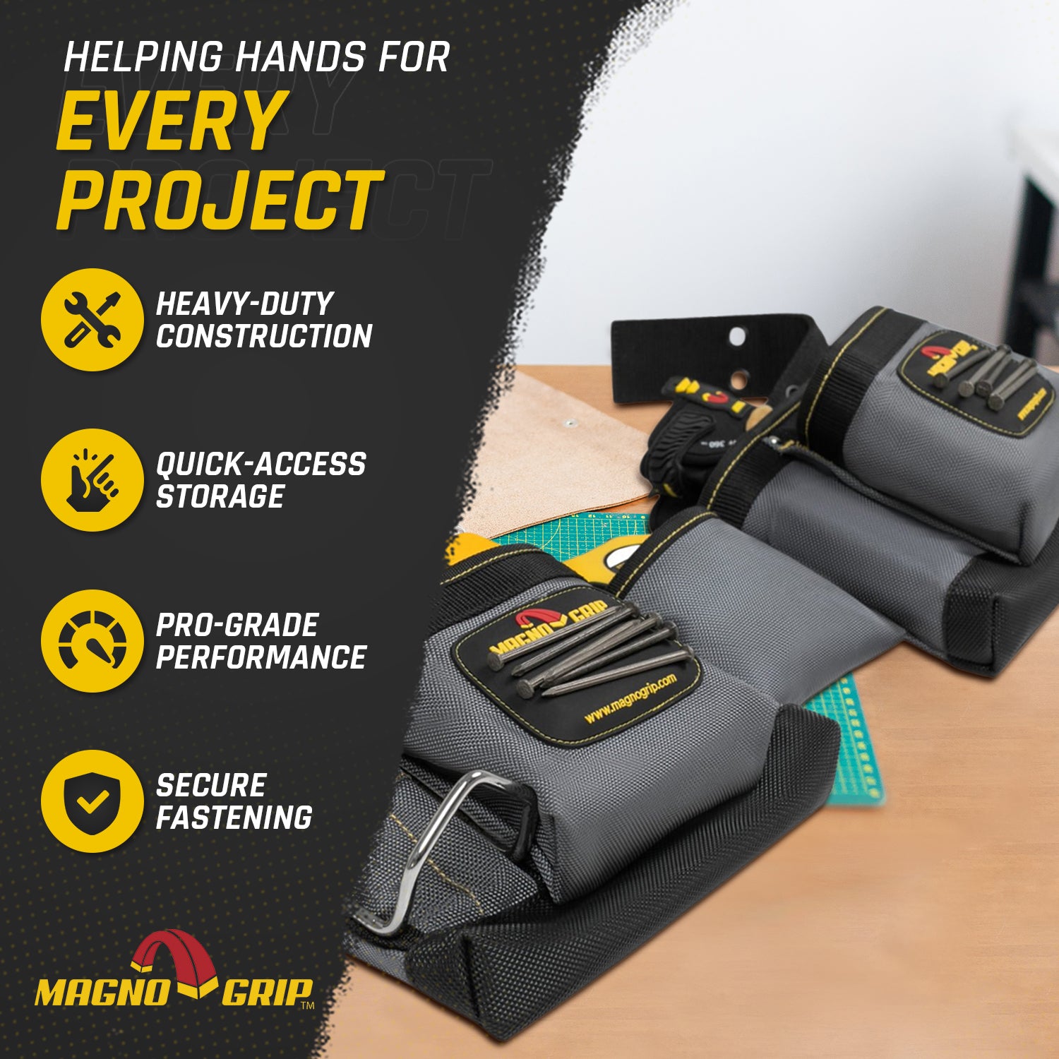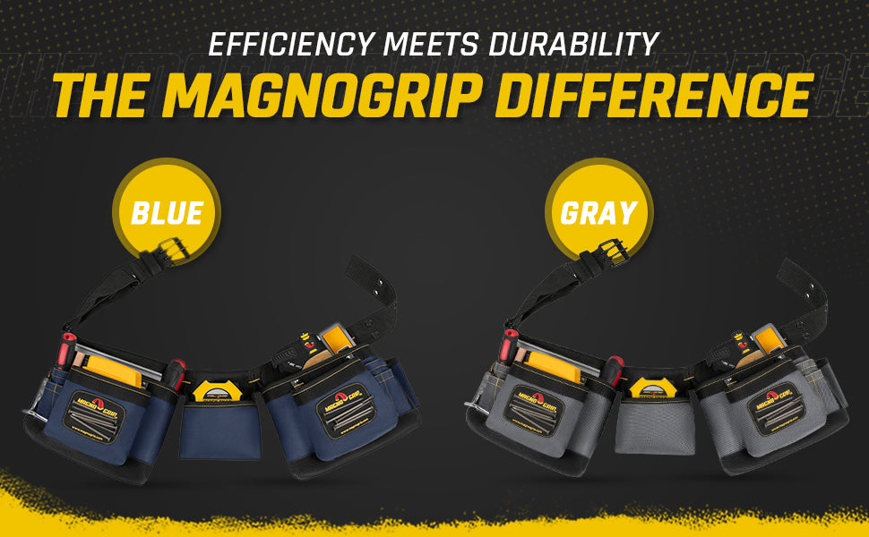 MagnoGrip is a manufacturer of professional duty magnetic work gear. All of our magnetic tool belts are built to satisfy the requirements of the Pro. We reinforce our magnetic tool belts with rivets at the key stress points for increased durability. We use double-layered ballistic polyester to achieve a rugged lightweight construction that puts less strain on your back and more muscle into the gear so that it handles the most demanding jobs. Our revolutionary tool belts and rigs are embedded with strategically placed magnets that allow you to keep nails, screws, drill bits and small tools securely organized and within reach. Now you can work without losing your tools or your patience!
