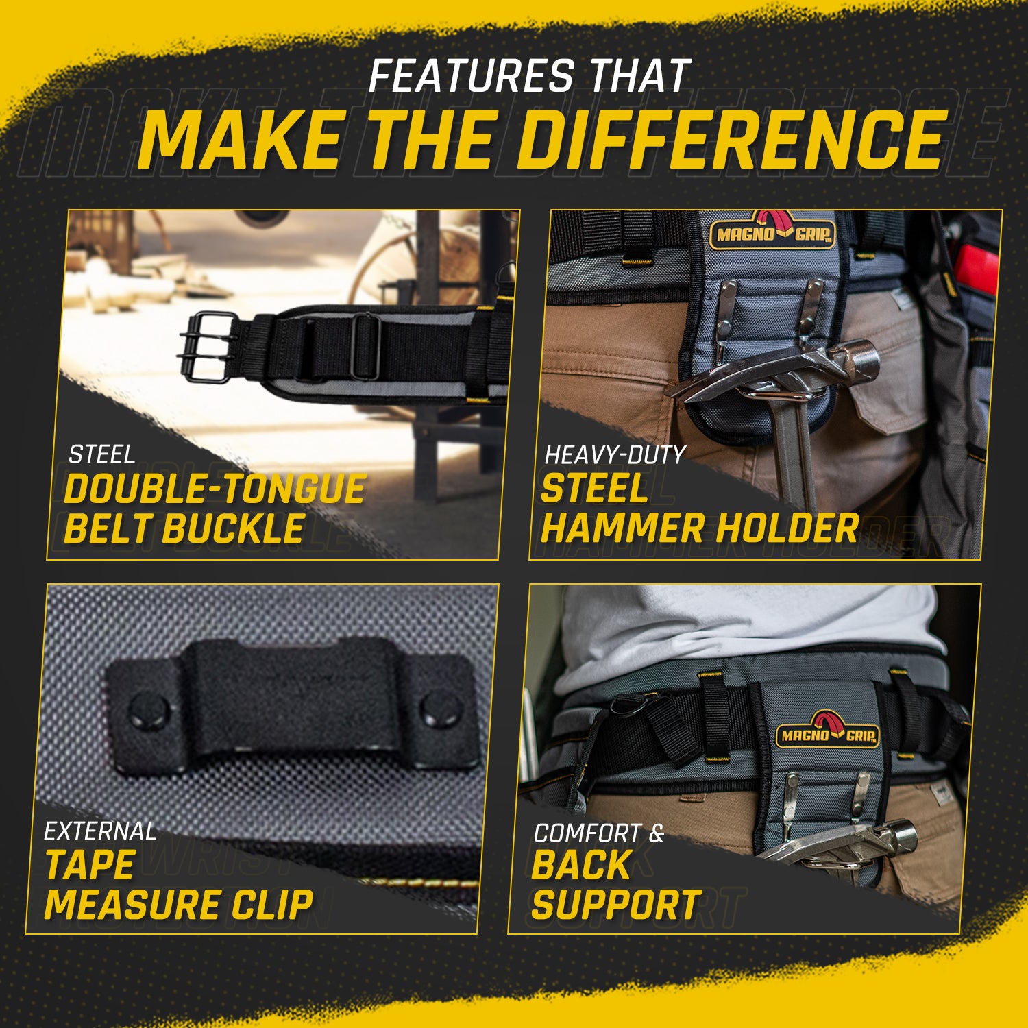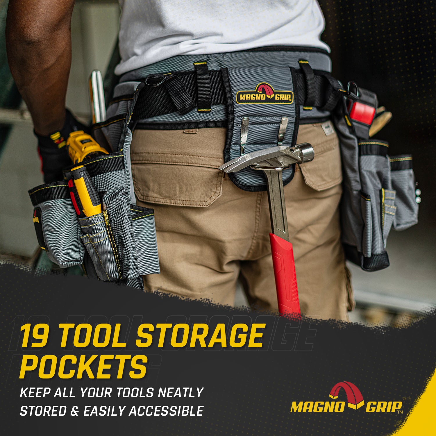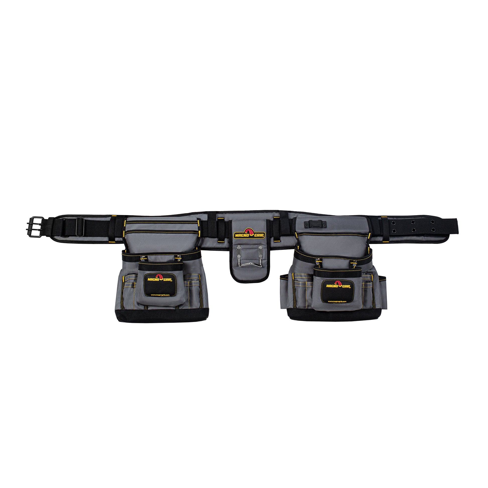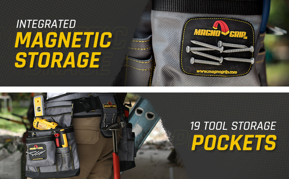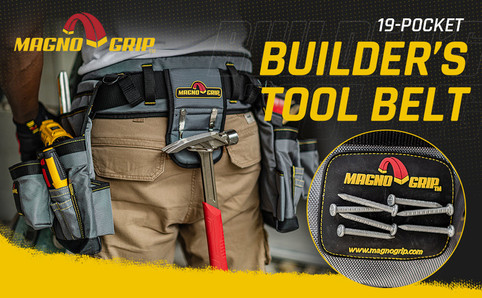 The MagnoGrip Builder’s Tool Belt features 19 pockets for convenient tool storage and includes a padded belt with breathable mesh for all day comfort and back support. Additional features include a tape measure clip for easy access, steel double-tongue belt buckle with roller bar and a heavy duty padded steel hammer holder.