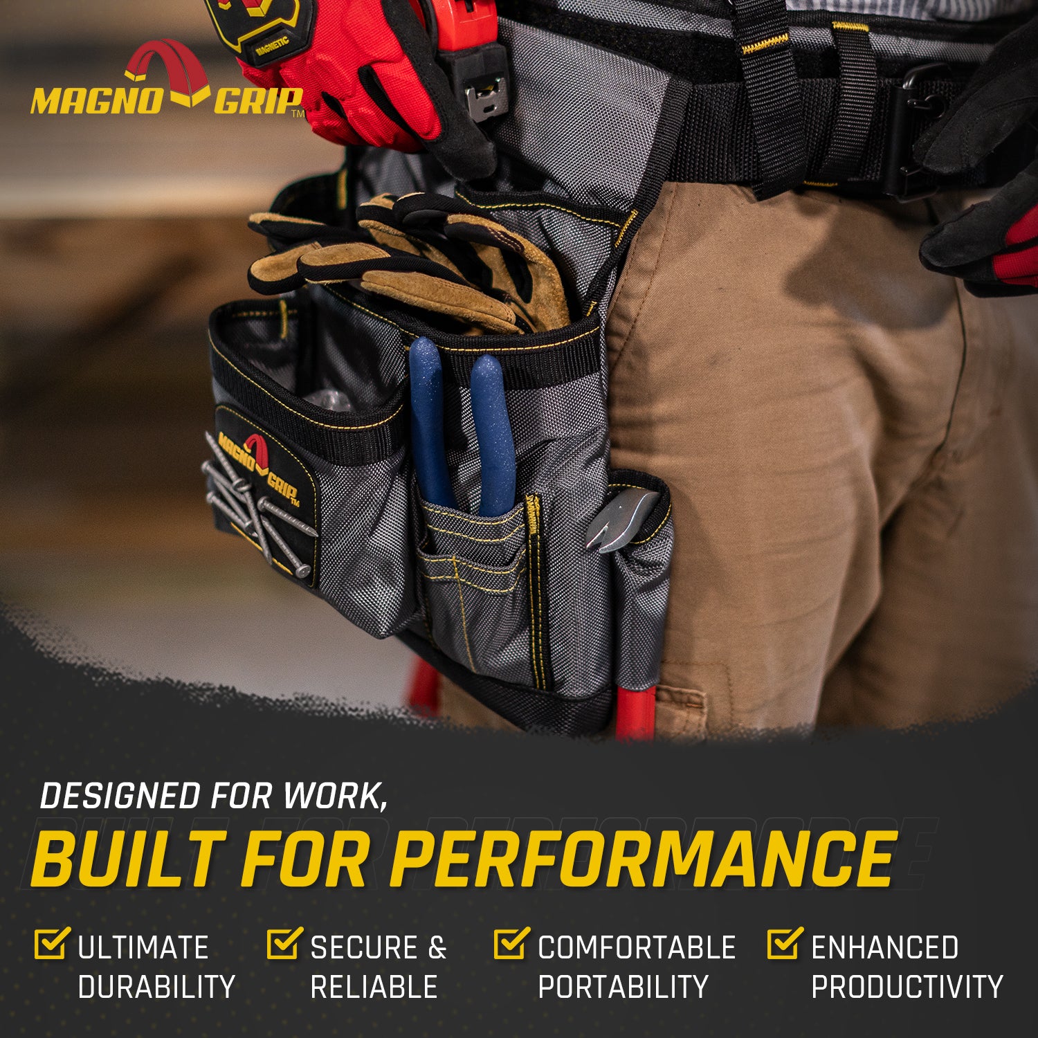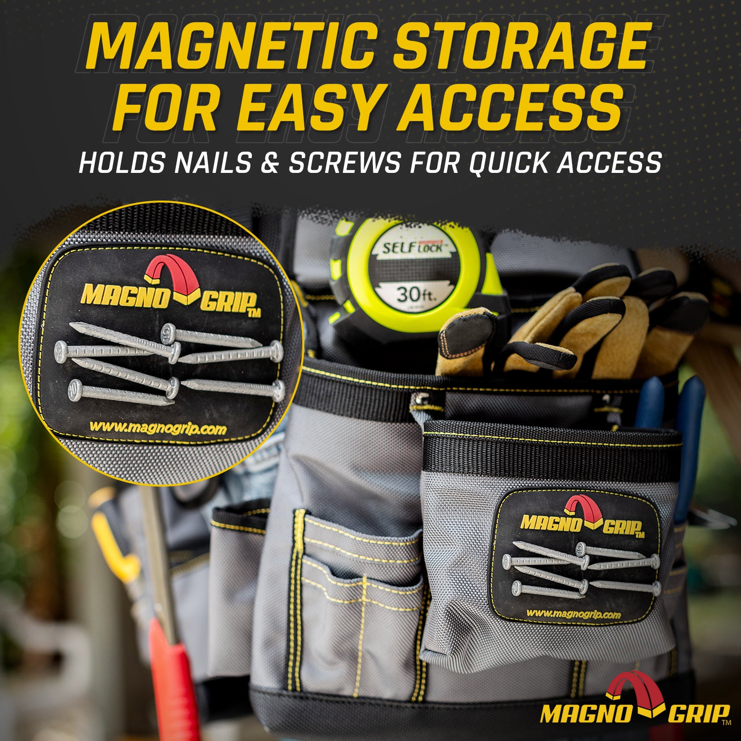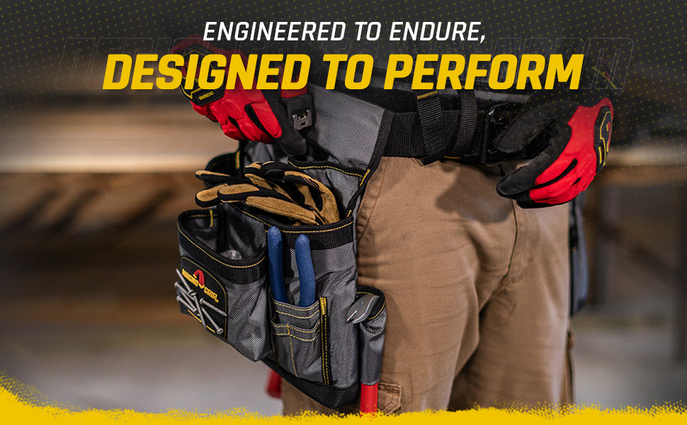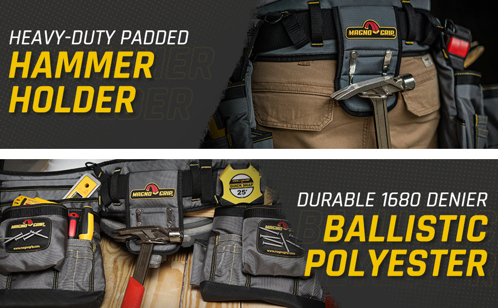 Introducing MagnoGrip Work Gear, our Pro Grade line of tool belts, rigs and pouches that’s built to handle your most demanding jobs. MagnoGrip’s innovative work gear incorporates magnetic storage for quick access to your nails and screws. Our tool belts, rigs and pouches are built with heavy duty 1680 Denier Ballistic Polyester and reinforced with rivets at the key stress points for maximum durability.