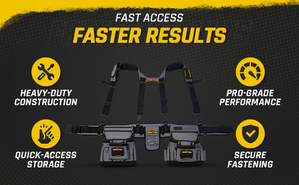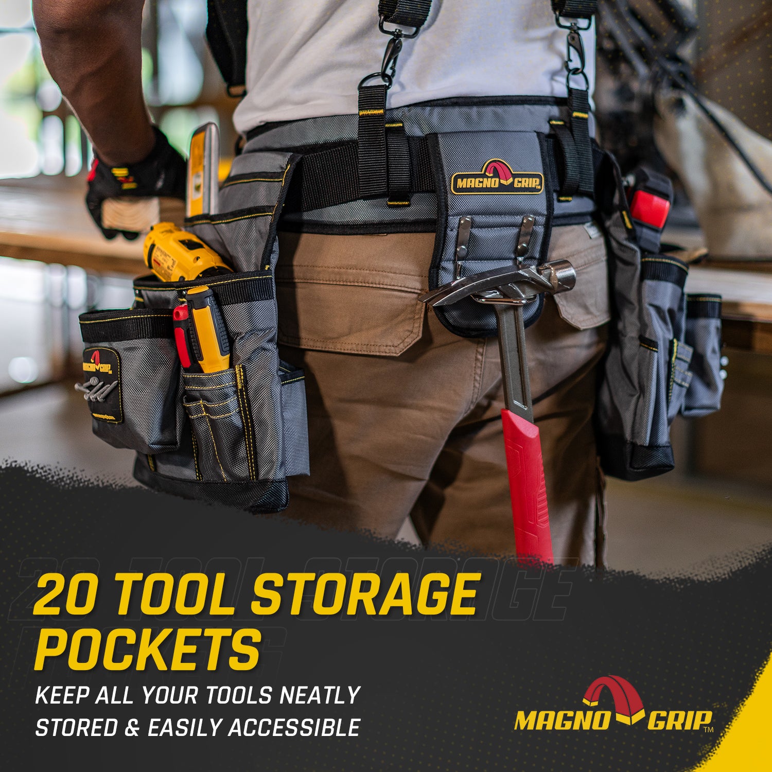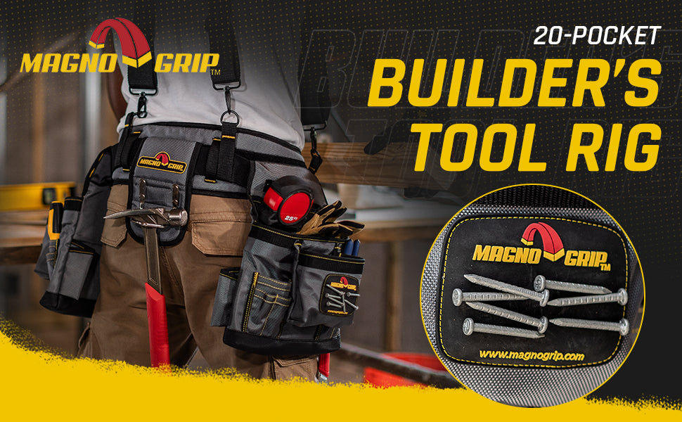 The MagnoGrip Builder's Tool Rig features 20 pockets for convenient tool storage and includes an adjustable padded suspenders with integrated smart phone pouch. Additional features include a padded belt with breathable mesh for all day comfort and back support, tape measure clip for easy access, steel double-tongue belt buckle with roller bar and a heavy duty padded steel hammer holder.