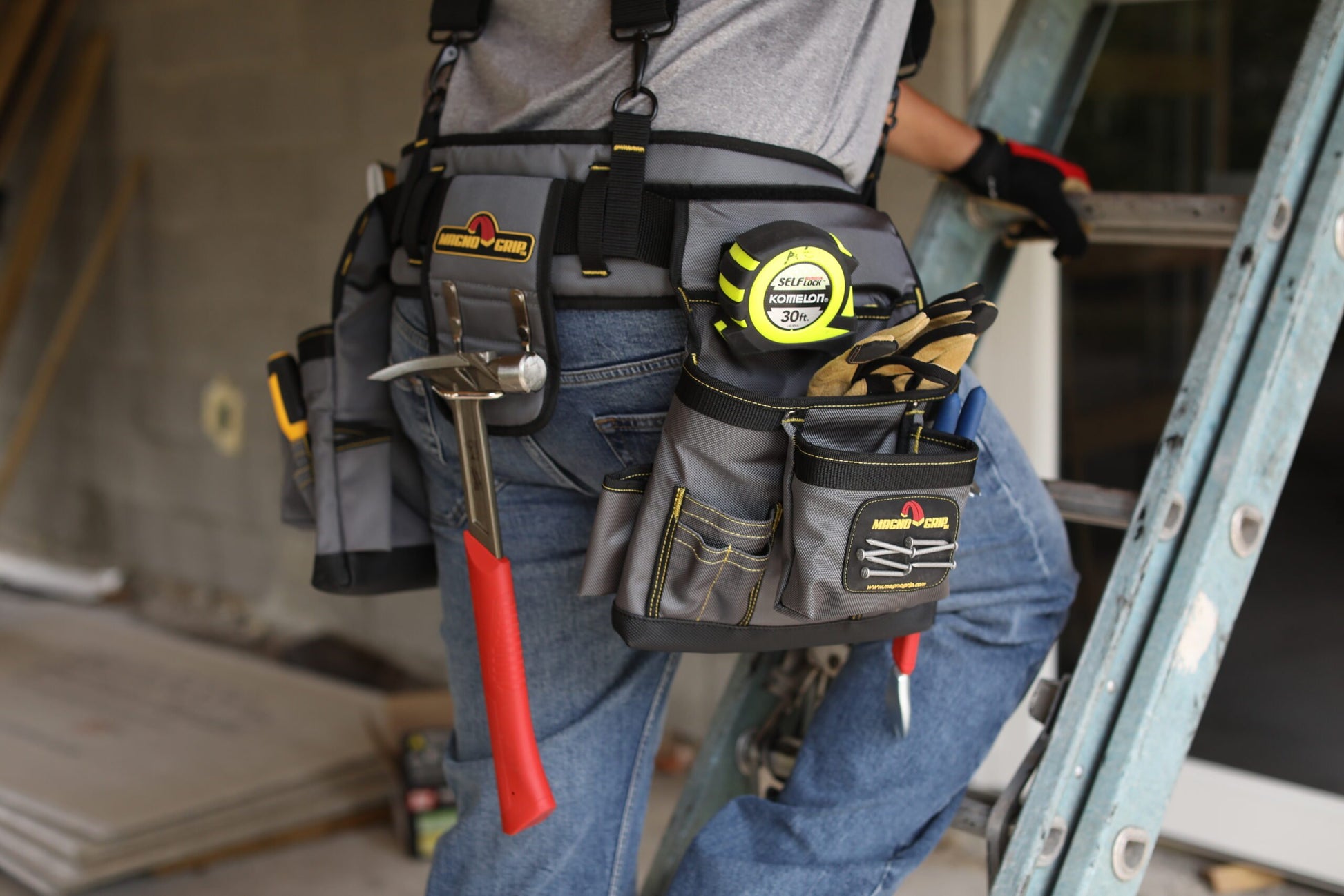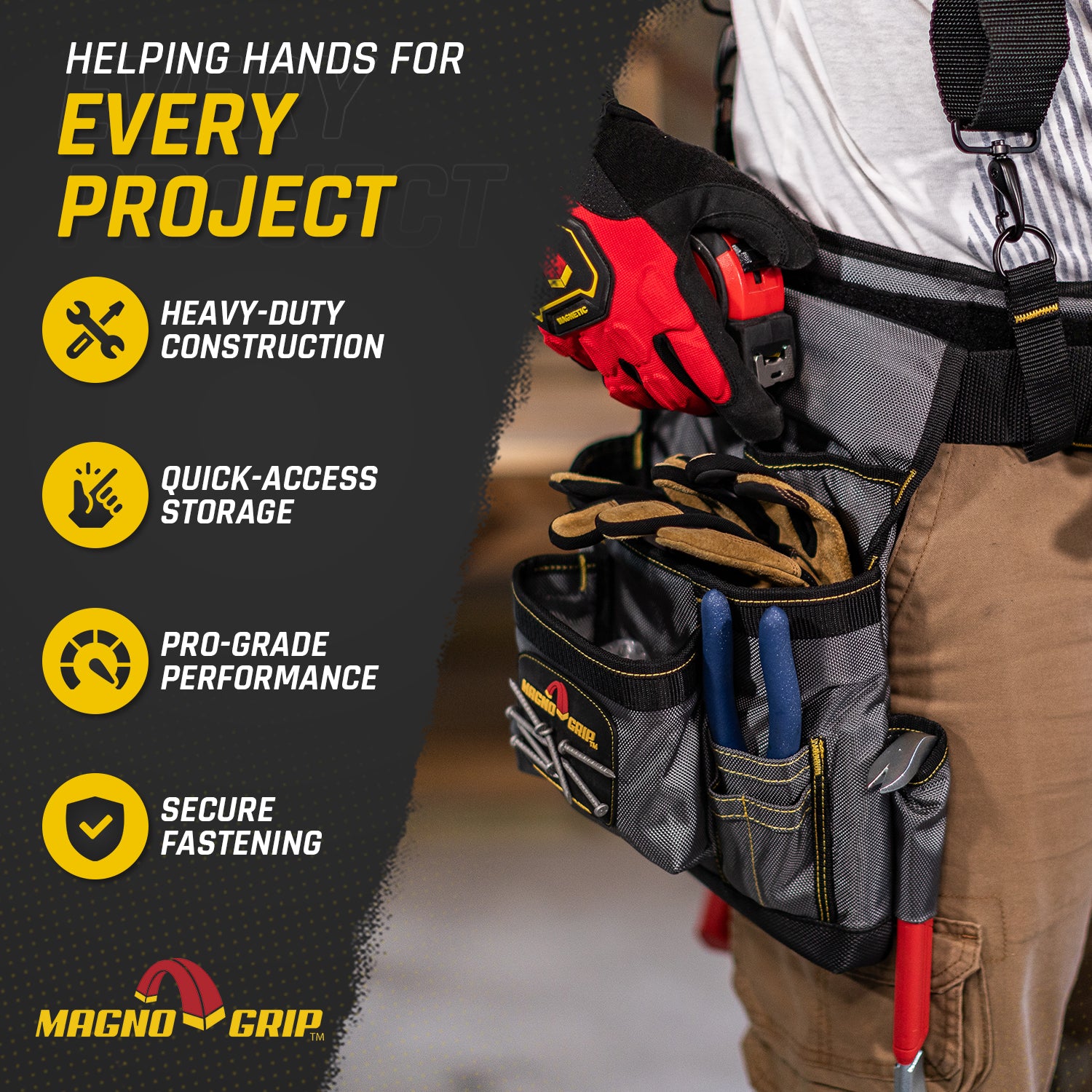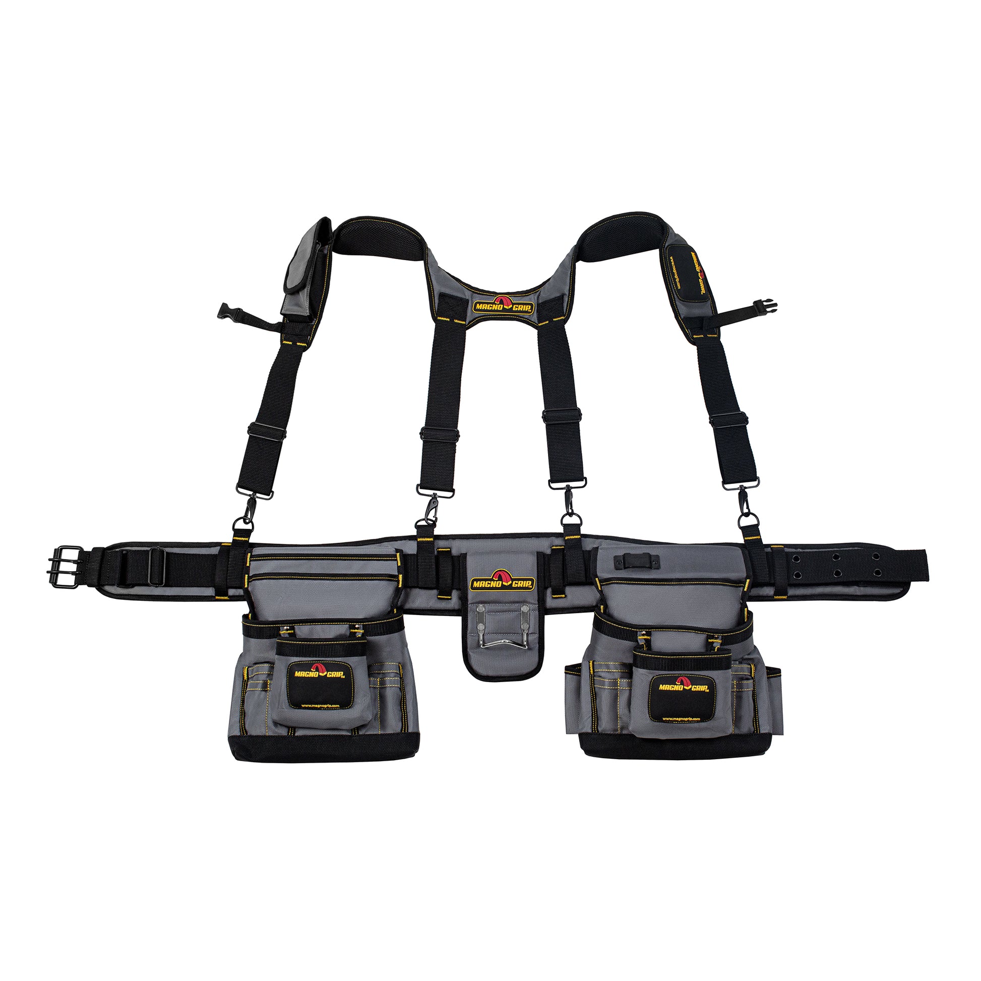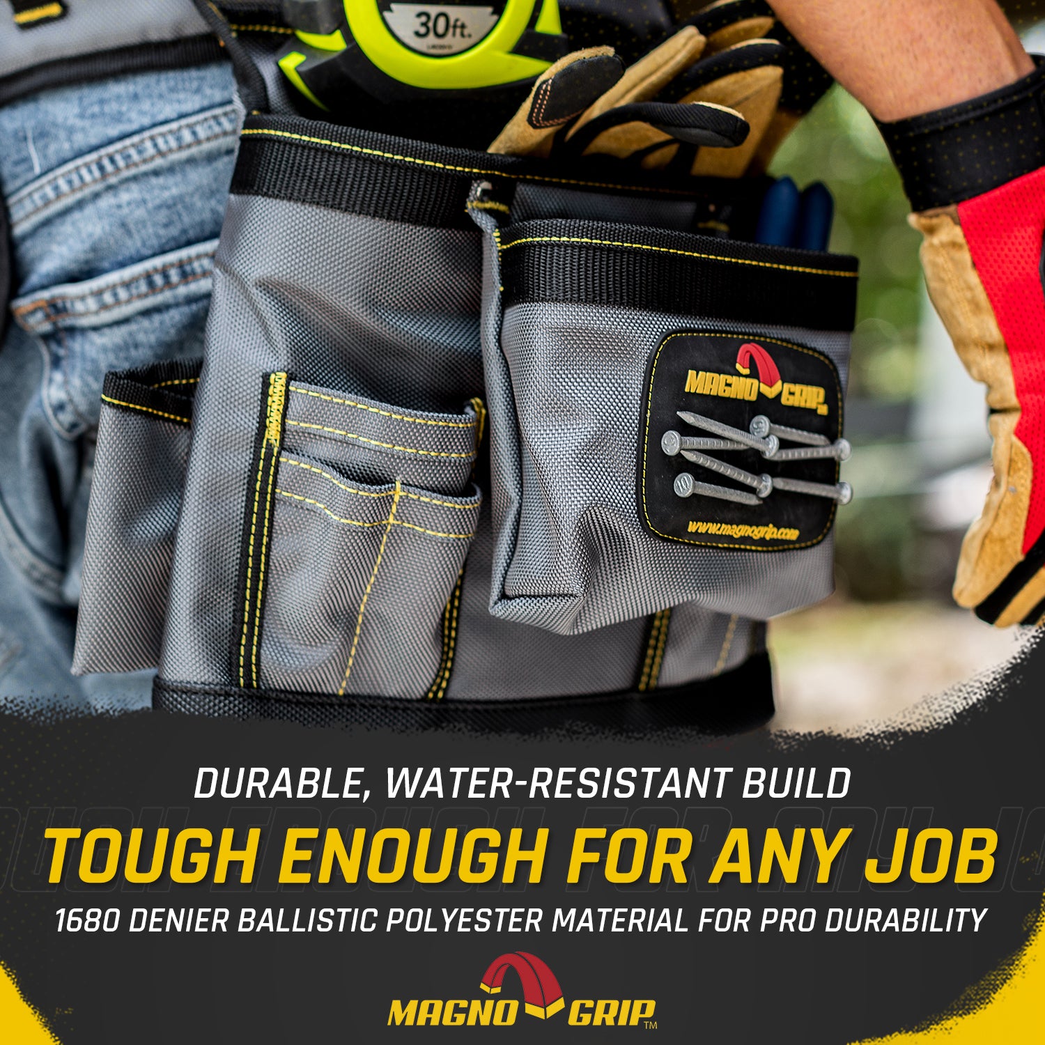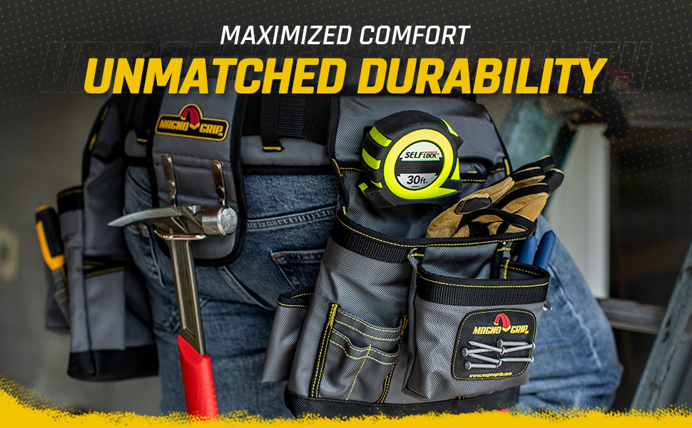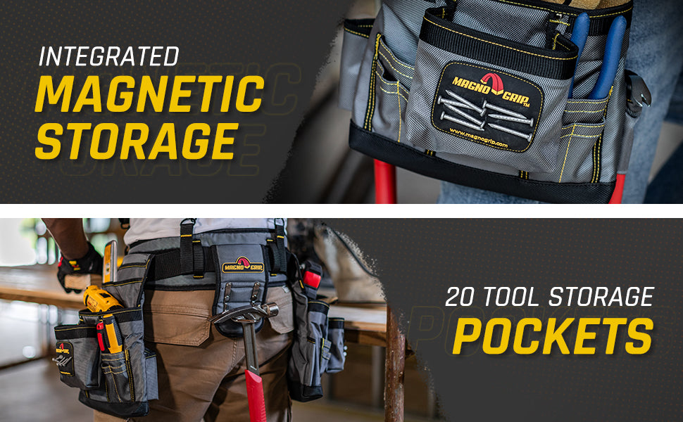 Introducing MagnoGrip Work Gear, our Pro Grade line of tool belts, rigs and pouches that's built to handle your most demanding jobs. MagnoGrip's innovative work gear incorporates magnetic storage for quick access to your nails and screws. Our tool belts, rigs and pouches are built with heavy duty 1680 Denier Ballistic Polyester and reinforced with rivets at the key stress points for maximum durability.