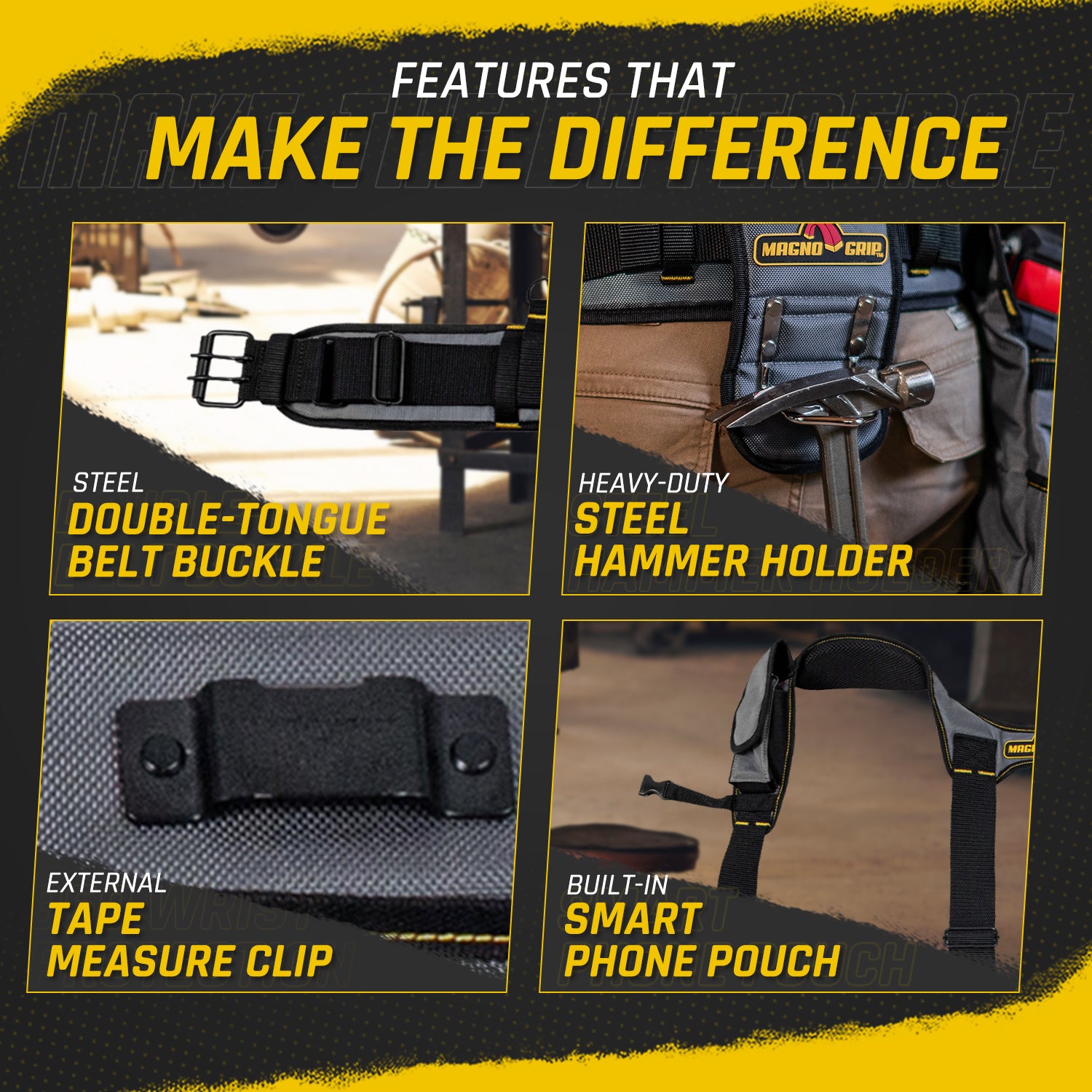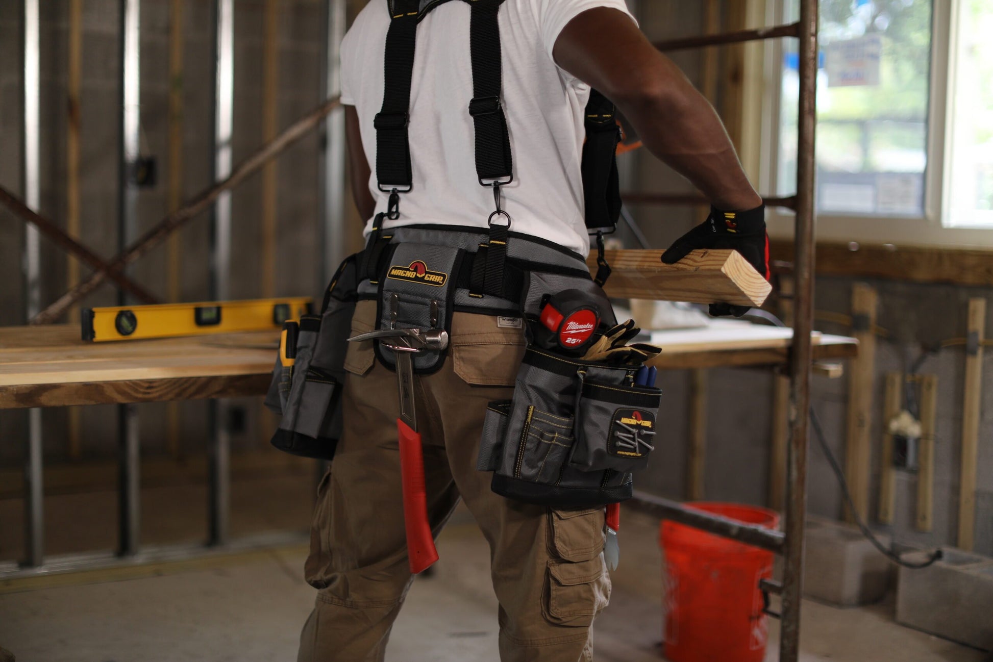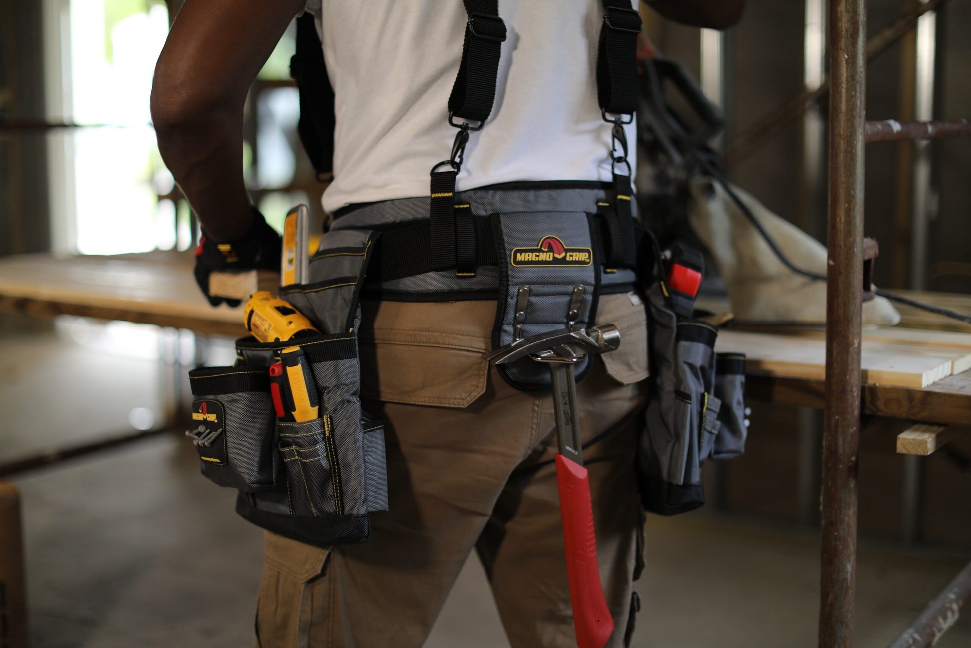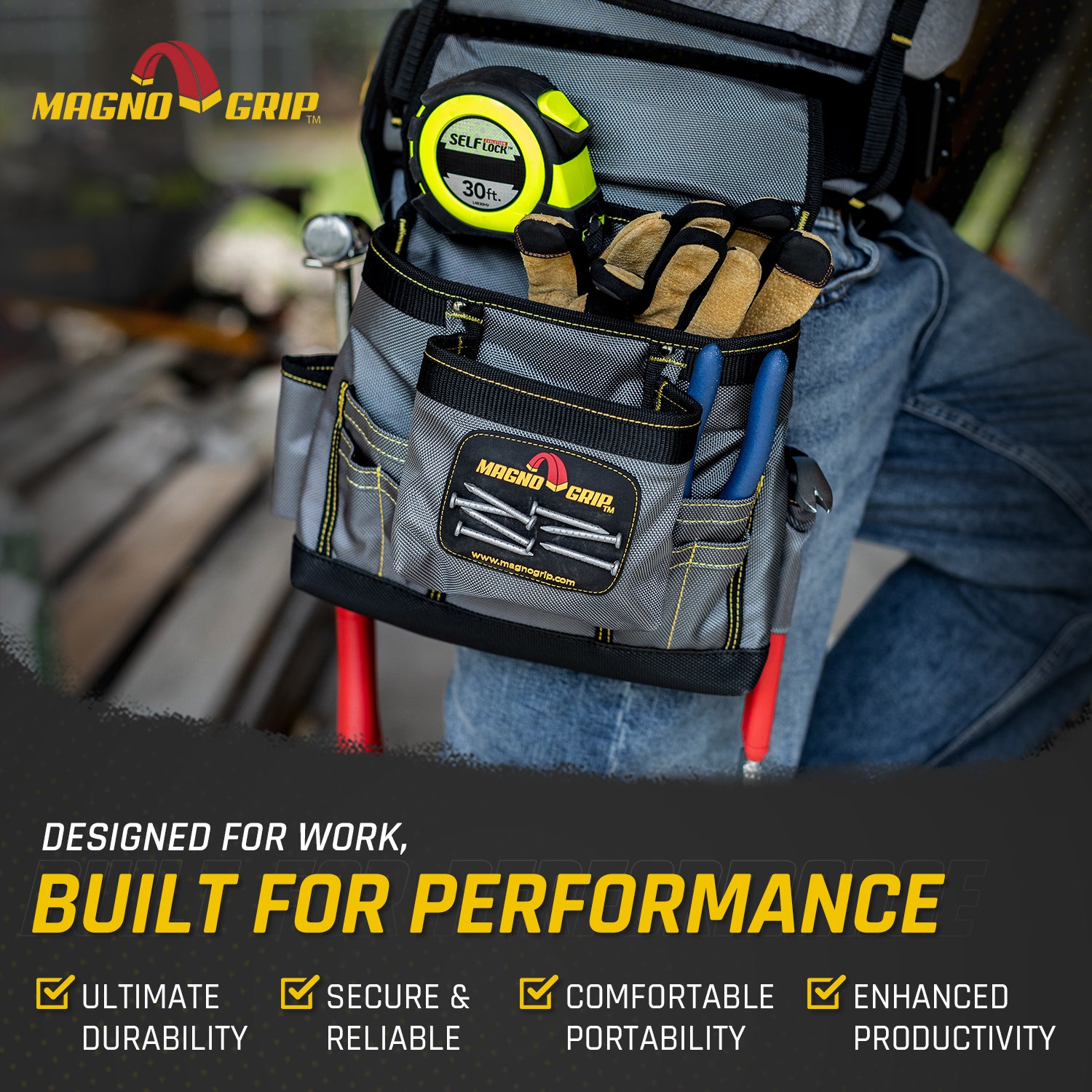 Introducing MagnoGrip Work Gear, our Pro Grade line of tool belts, rigs and pouches that's built to handle your most demanding jobs. MagnoGrip's innovative work gear incorporates magnetic storage for quick access to your nails and screws. Our tool belts, rigs and pouches are built with heavy duty 1680 Denier Ballistic Polyester and reinforced with rivets at the key stress points for maximum durability.