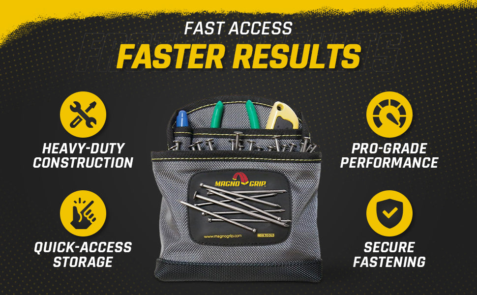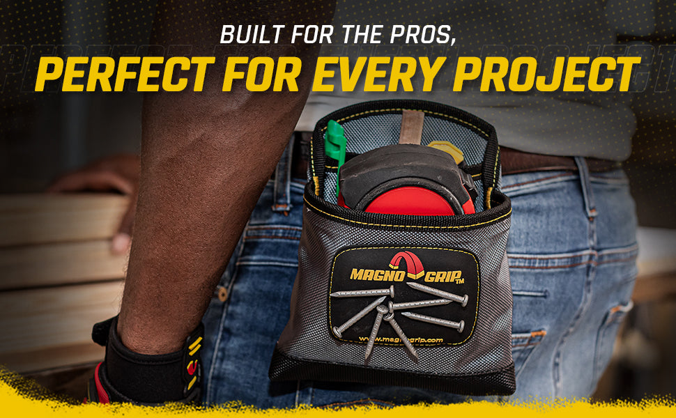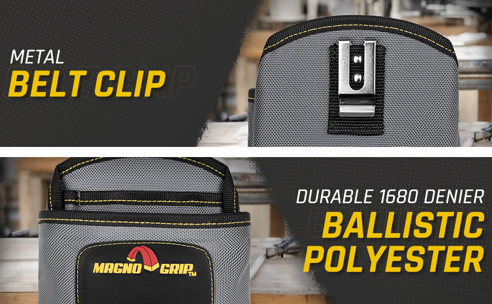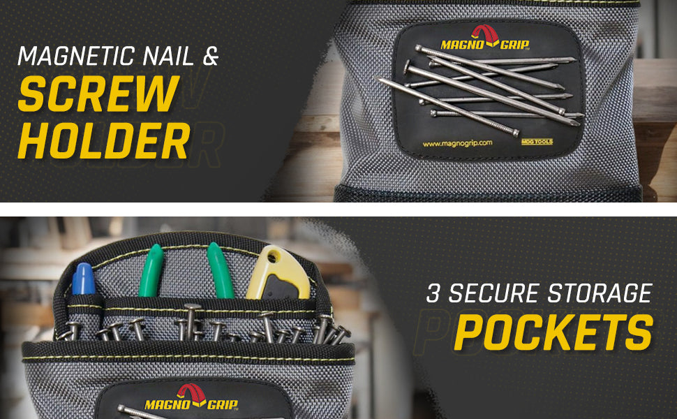 Introducing MagnoGrip Work Gear, our Pro Grade line of tool belts, rigs and pouches that's built to handle your most demanding jobs. MagnoGrip's innovative work gear incorporates magnetic storage for quick access to your nails and screws. Our tool belts, rigs and pouches are built with heavy duty 1680 Denier Ballistic Polyester and reinforced with rivets at the key stress points for maximum durability.