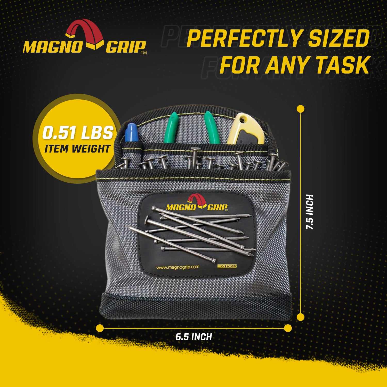 The MagnoGrip Pro Tool Pouch features 10 pockets for convenient tool storage and a 3 inch belt loop for compatibility with tool belts and rigs. Additional features include an adjustable belt and a heavy duty steel hammer holder.