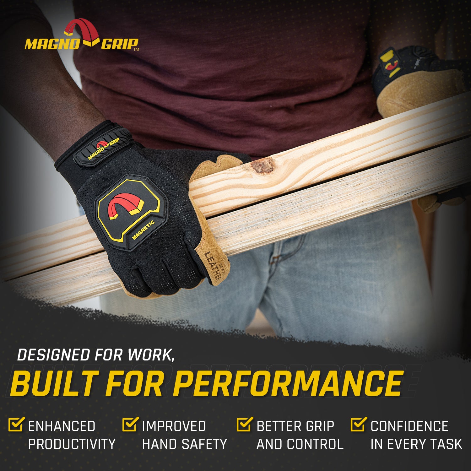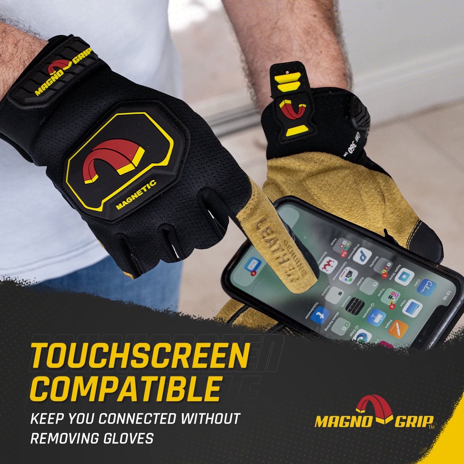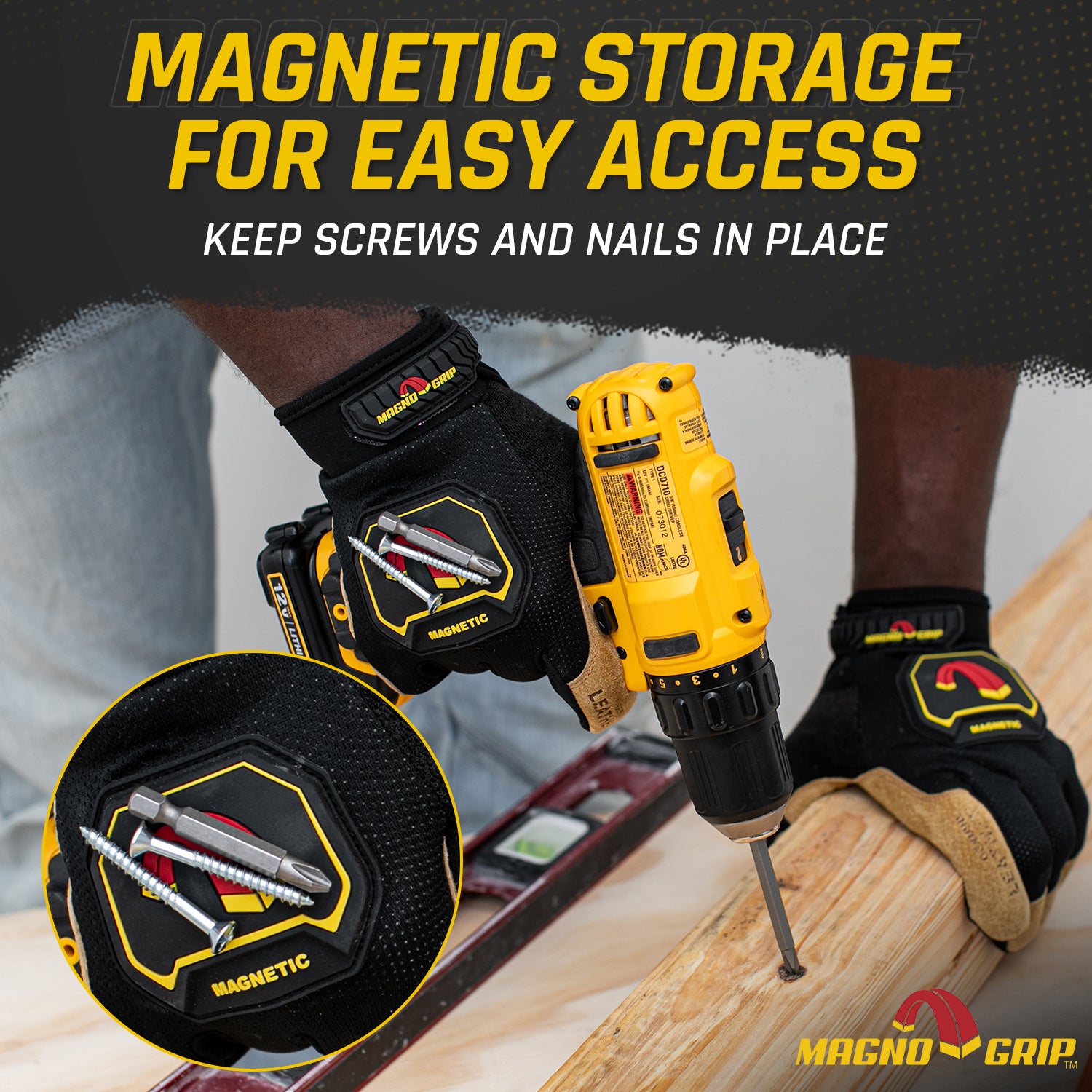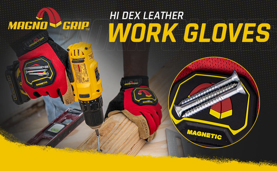 Introducing MagnoGrip Magnetic Work Gloves, our Pro Grade line of multi-purpose safety gloves that's built to handle your most demanding jobs. Our Heavy Duty Hi Dex Leather Work Glove is integrated with Magnetic Storage and Touchscreen Technology. The back of the glove is embedded with strong neodymium magnets to securely hold screws, nails, bolts, washers, drill bits and metal fasteners. The thumb, index and middle fingers are enabled with Touchscreen Technology for operating smart phones and tablets. While the padded magnetic area provides impact protection to the back of the hand.
