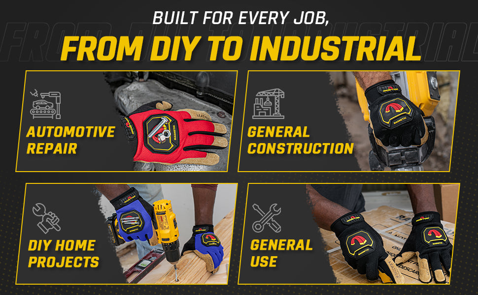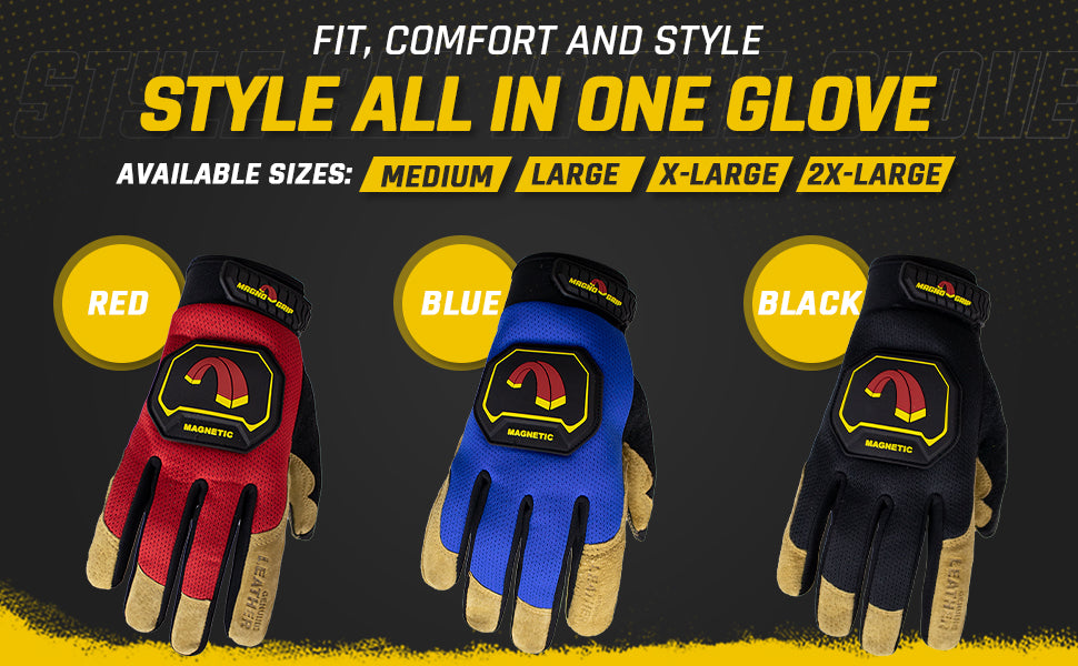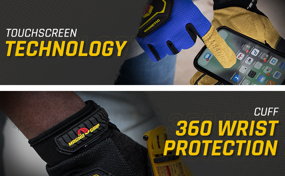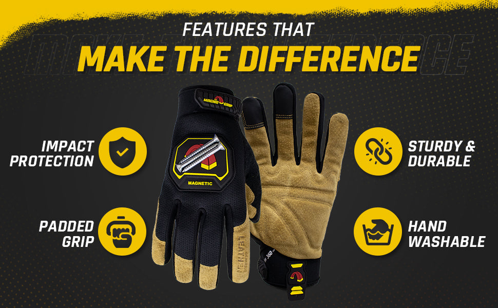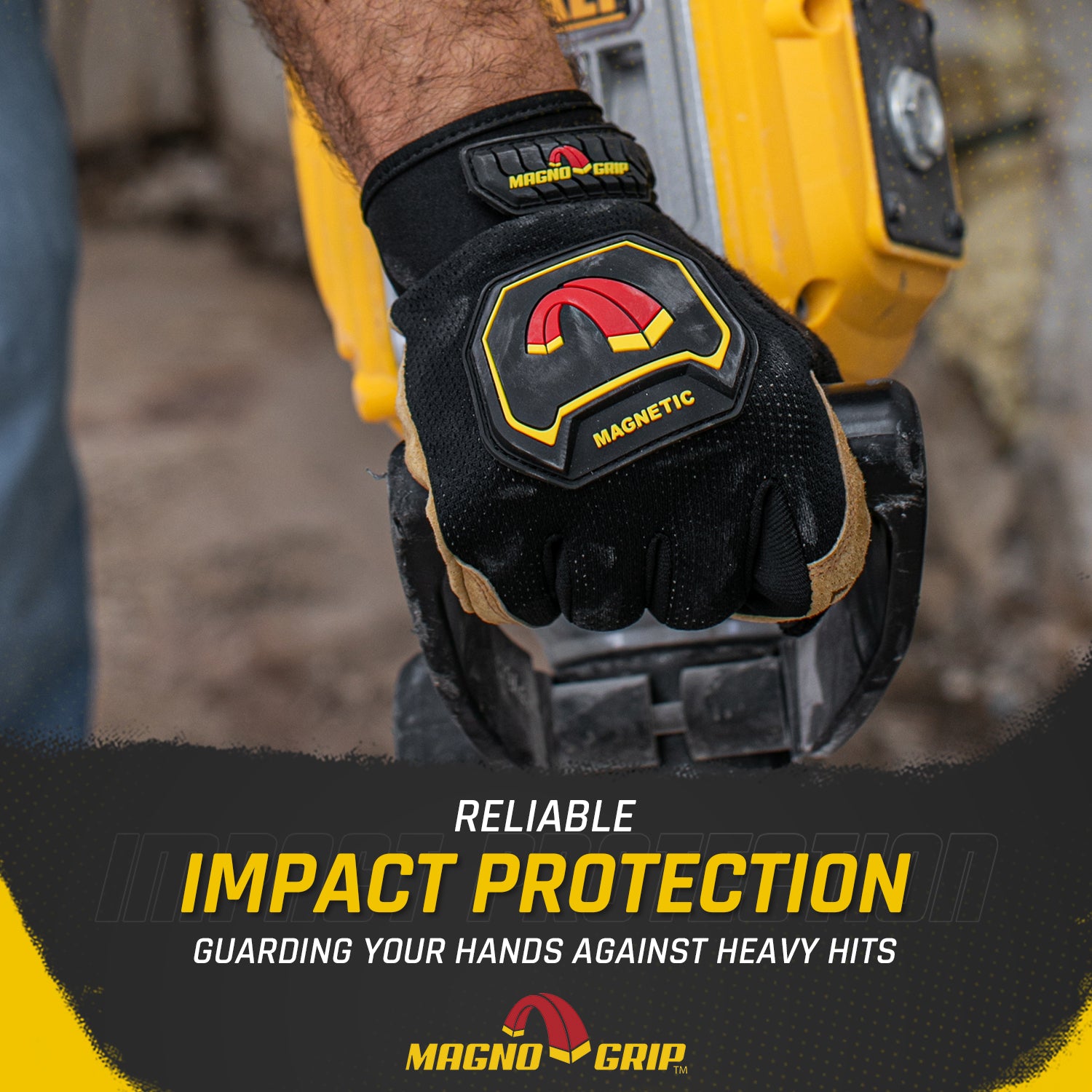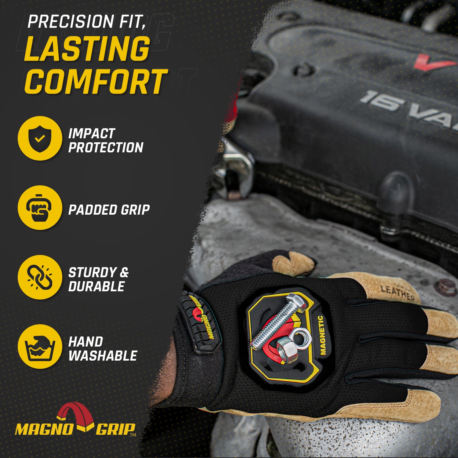 Introducing MagnoGrip Magnetic Work Gloves, our Pro Grade line of multi-purpose safety gloves that's built to handle your most demanding jobs. Our Heavy Duty Hi Dex Leather Work Glove is integrated with Magnetic Storage and Touchscreen Technology. The back of the glove is embedded with strong neodymium magnets to securely hold screws, nails, bolts, washers, drill bits and metal fasteners. The thumb, index and middle fingers are enabled with Touchscreen Technology for operating smart phones and tablets. While the padded magnetic area provides impact protection to the back of the hand.