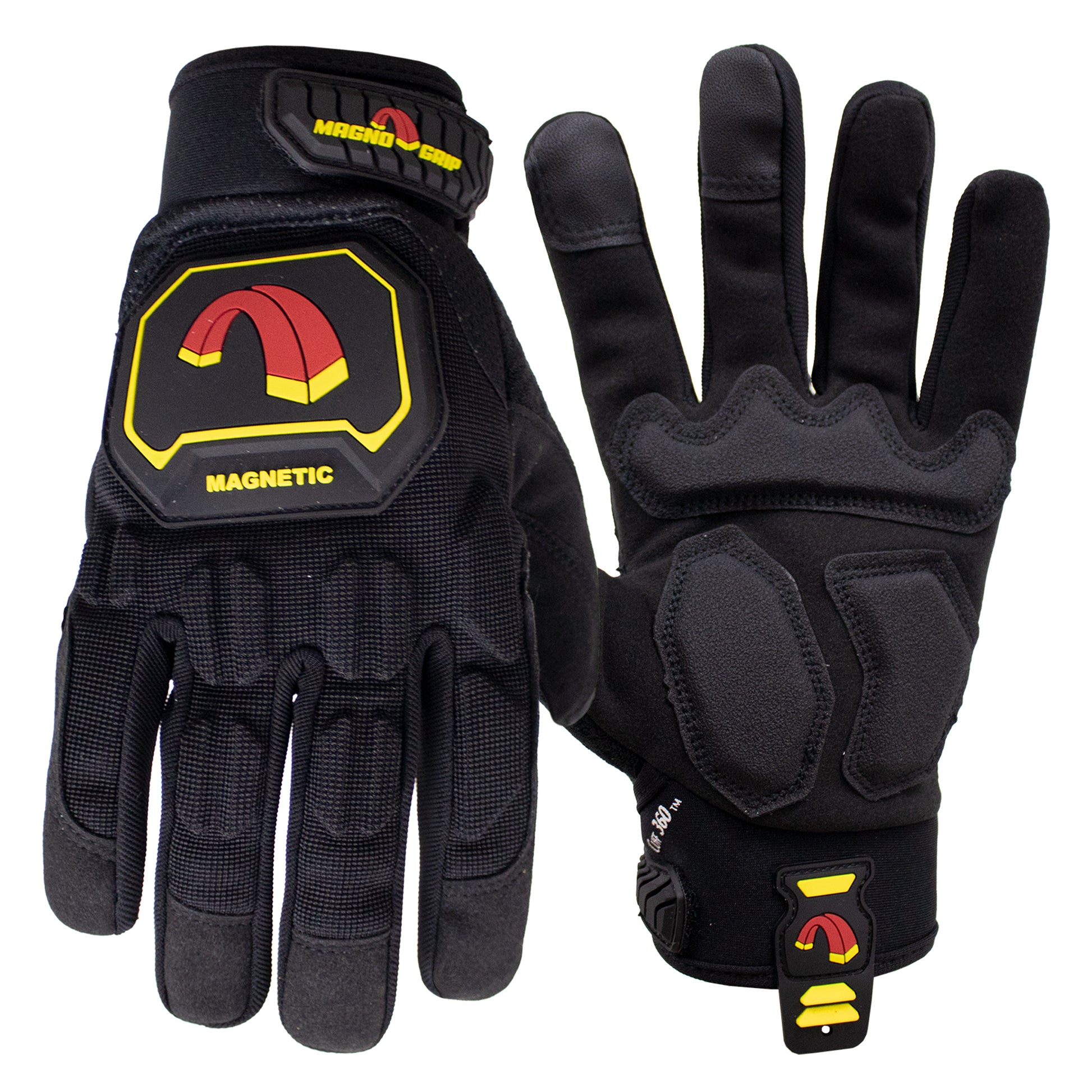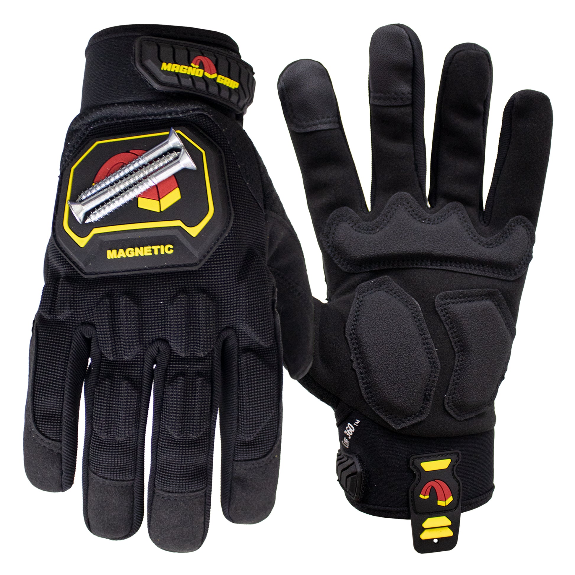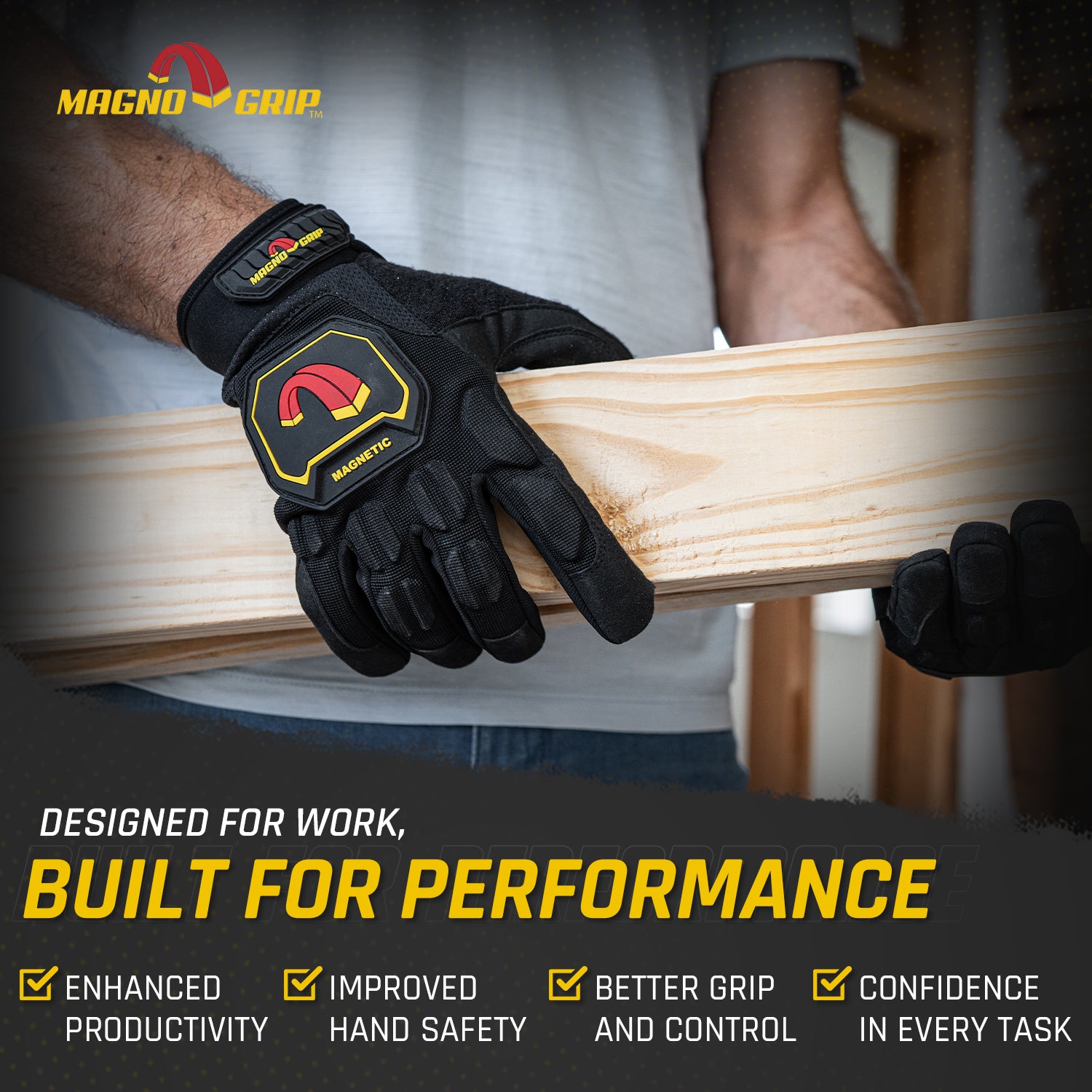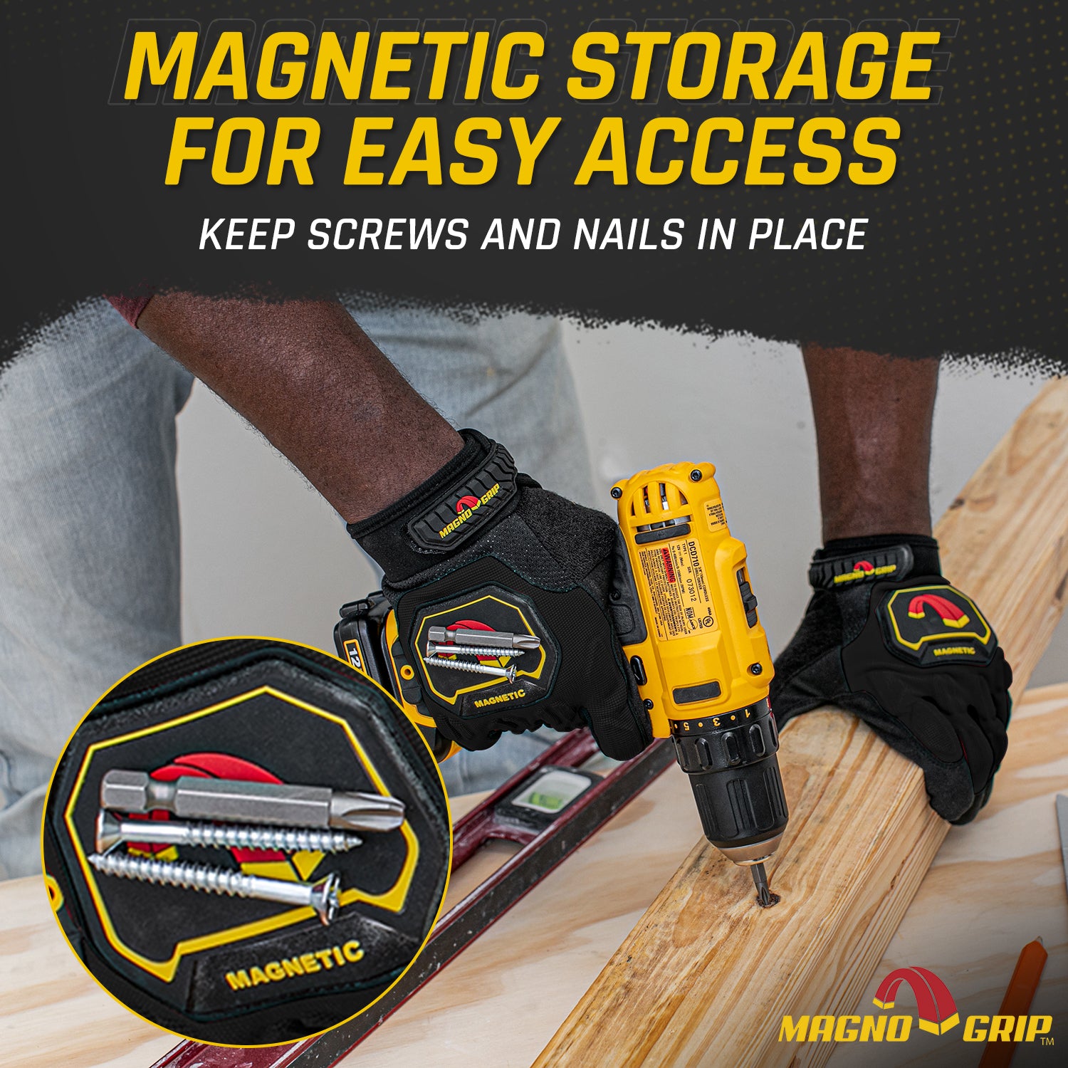 Introducing MagnoGrip Magnetic Work Gloves, our Pro Grade line of multi-purpose safety gloves that's built to handle your most demanding jobs. Our Pro Impact Work Glove is integrated with Magnetic Storage and Touchscreen Technology. The back of the glove is embedded with strong neodymium magnets to securely hold screws, nails, bolts, washers, drill bits and metal fasteners. The thumb, index and middle fingers are enabled with Touchscreen Technology for operating smart phones and tablets. While the infused gel and padded magnetic area provides impact protection to the knuckles, fingers and back of the hand.