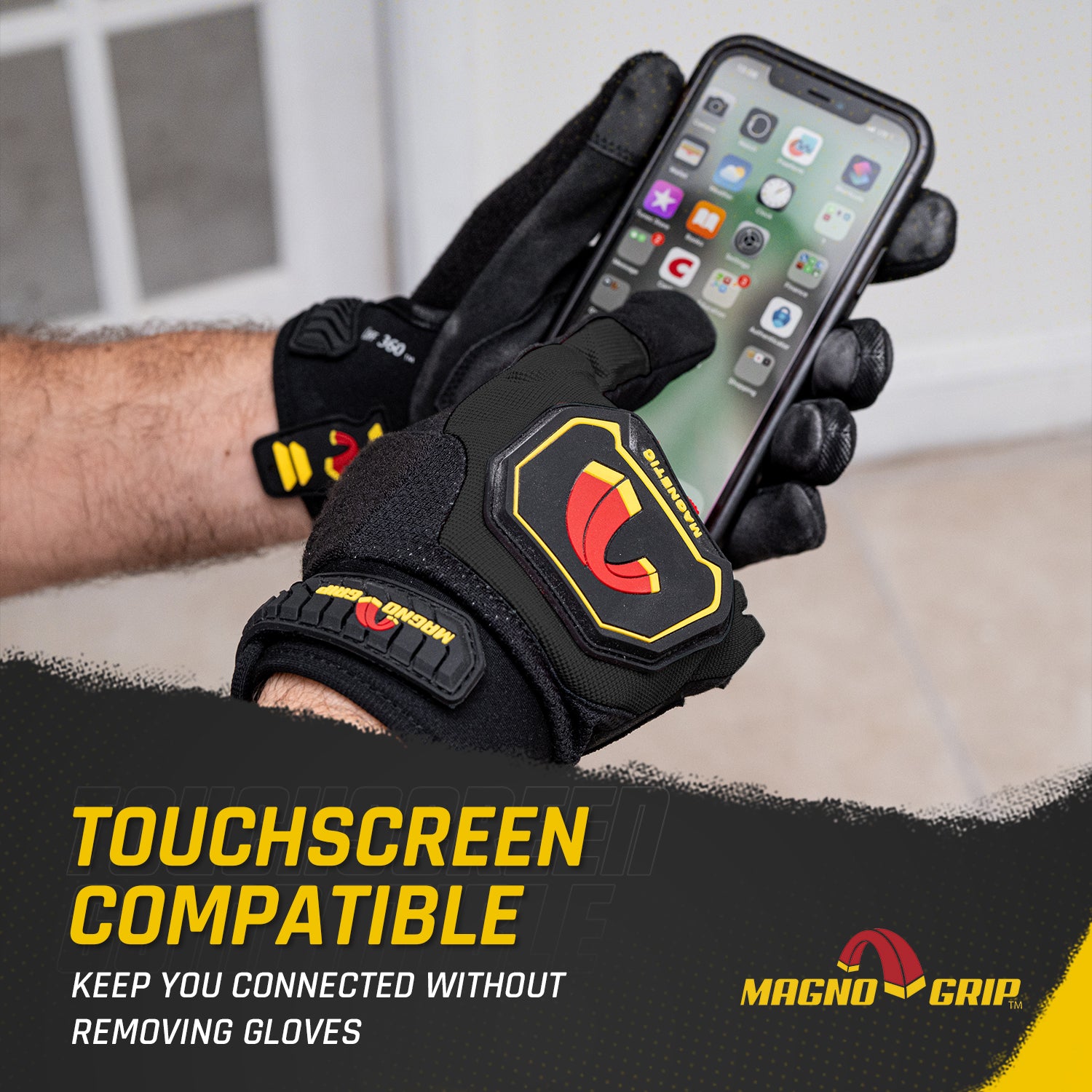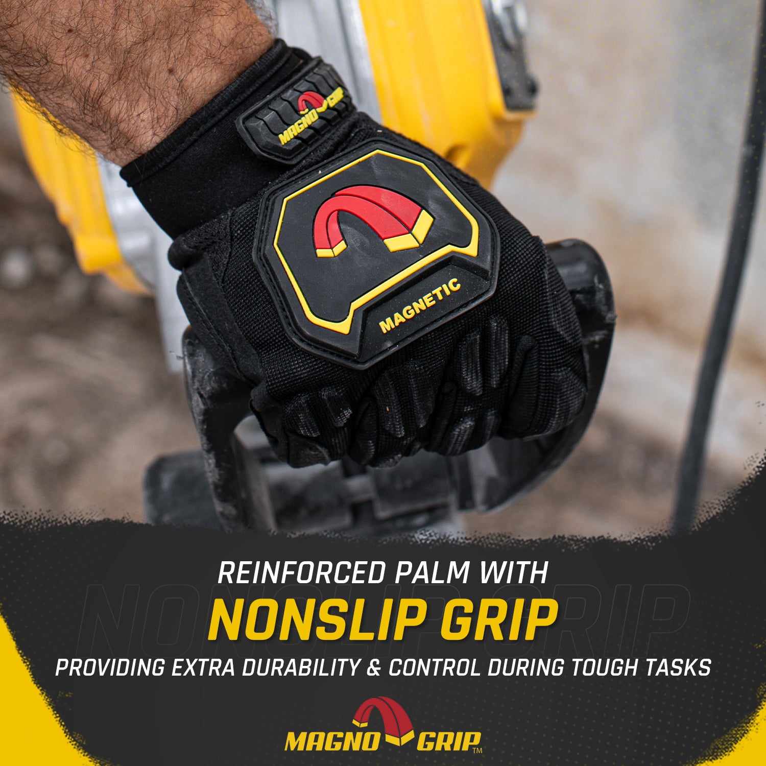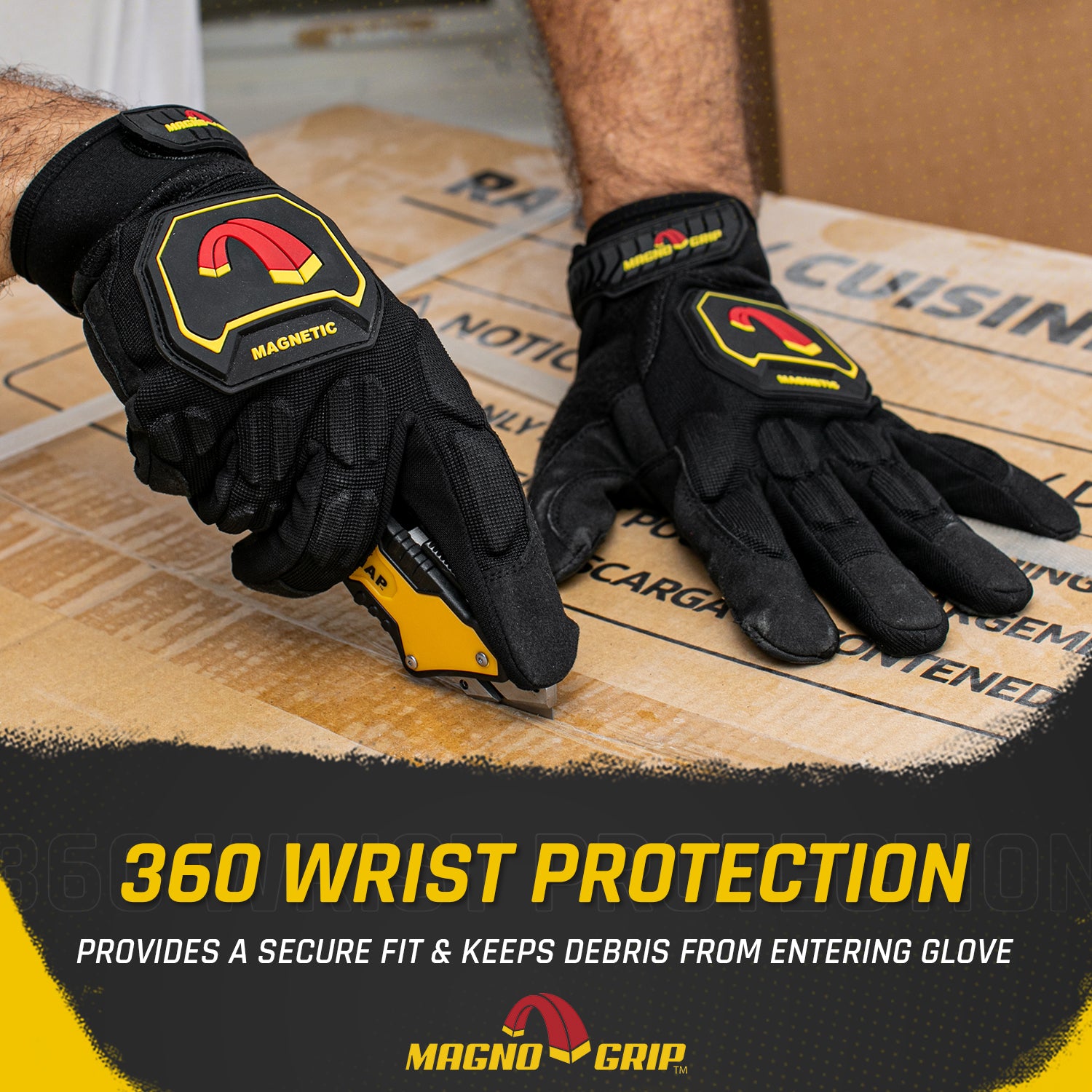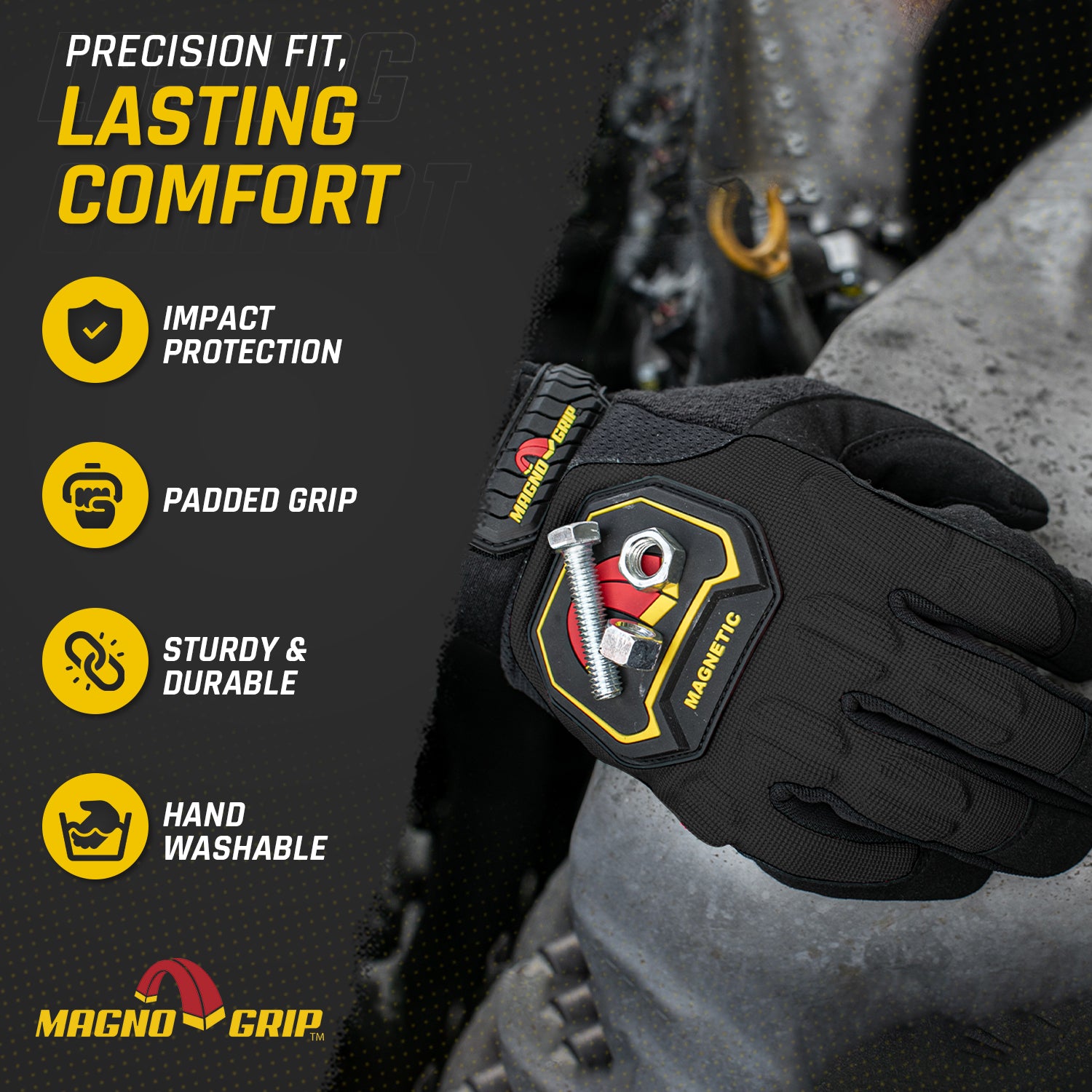 Introducing MagnoGrip Magnetic Work Gloves, our Pro Grade line of multi-purpose safety gloves that's built to handle your most demanding jobs. Our Pro Impact Work Glove is integrated with Magnetic Storage and Touchscreen Technology. The back of the glove is embedded with strong neodymium magnets to securely hold screws, nails, bolts, washers, drill bits and metal fasteners. The thumb, index and middle fingers are enabled with Touchscreen Technology for operating smart phones and tablets. While the infused gel and padded magnetic area provides impact protection to the knuckles, fingers and back of the hand.