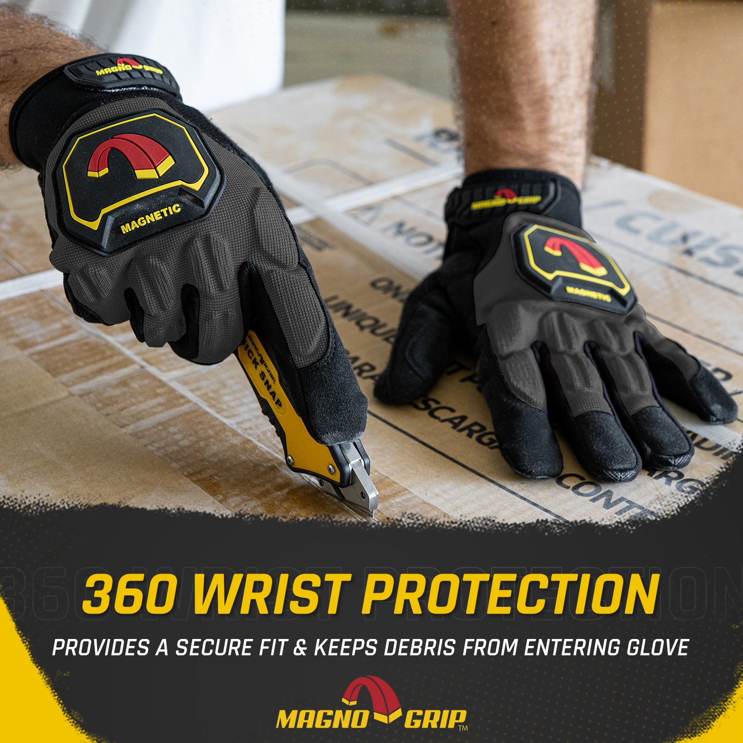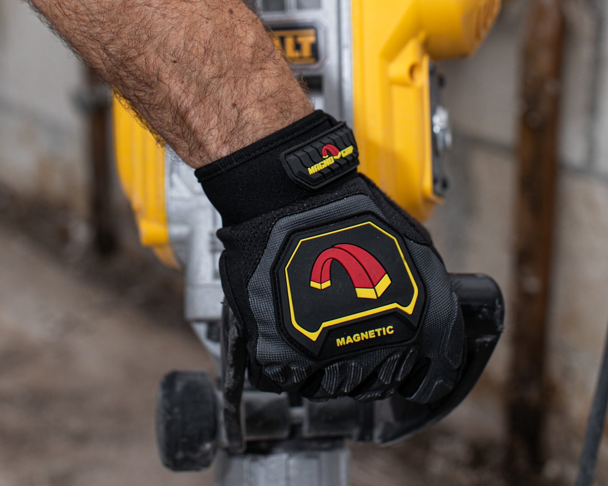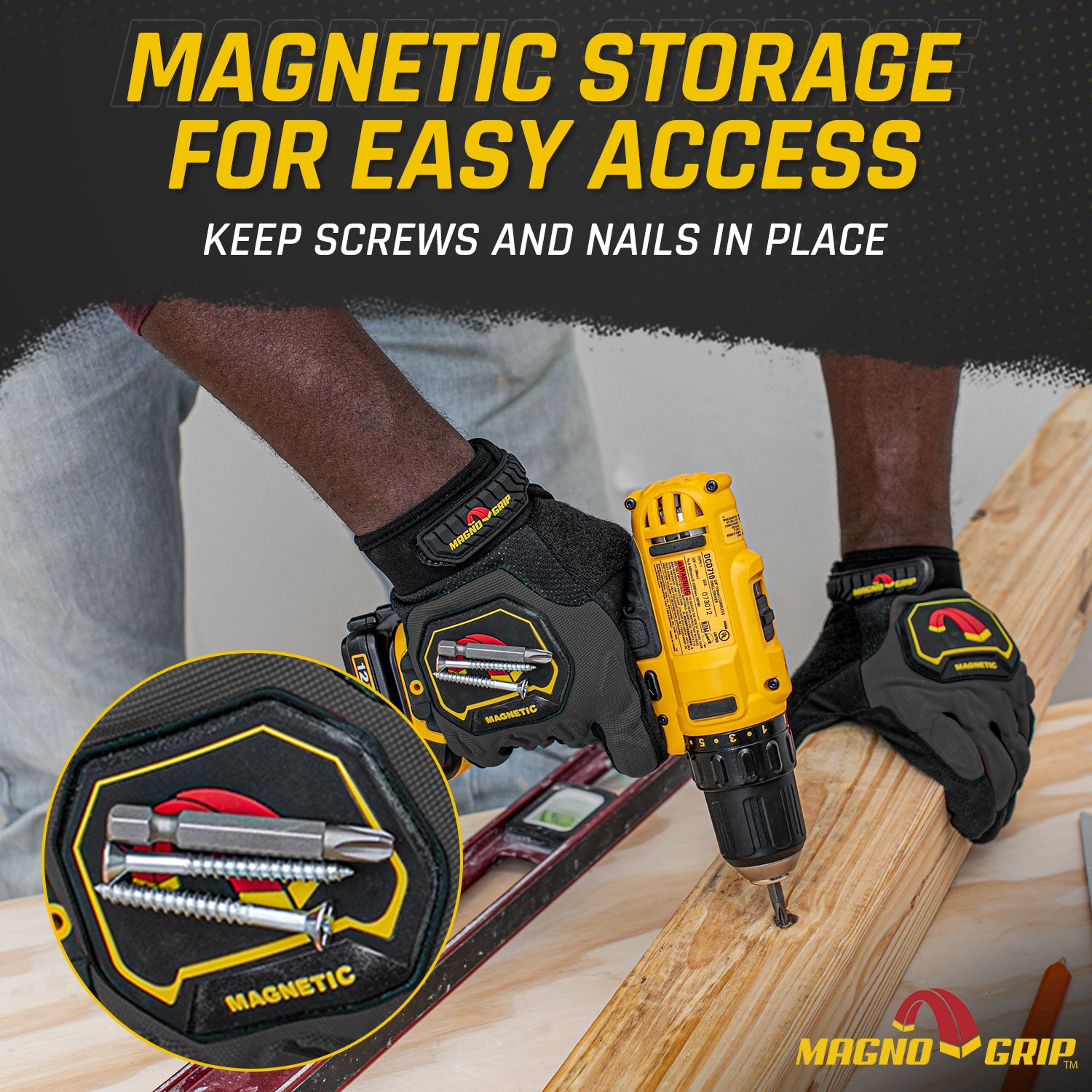 Introducing MagnoGrip Magnetic Work Gloves, our Pro Grade line of multi-purpose safety gloves that's built to handle your most demanding jobs. Our Pro Impact Work Glove is integrated with Magnetic Storage and Touchscreen Technology. The back of the glove is embedded with strong neodymium magnets to securely hold screws, nails, bolts, washers, drill bits and metal fasteners. The thumb, index and middle fingers are enabled with Touchscreen Technology for operating smart phones and tablets. While the infused gel and padded magnetic area provides impact protection to the knuckles, fingers and back of the hand.