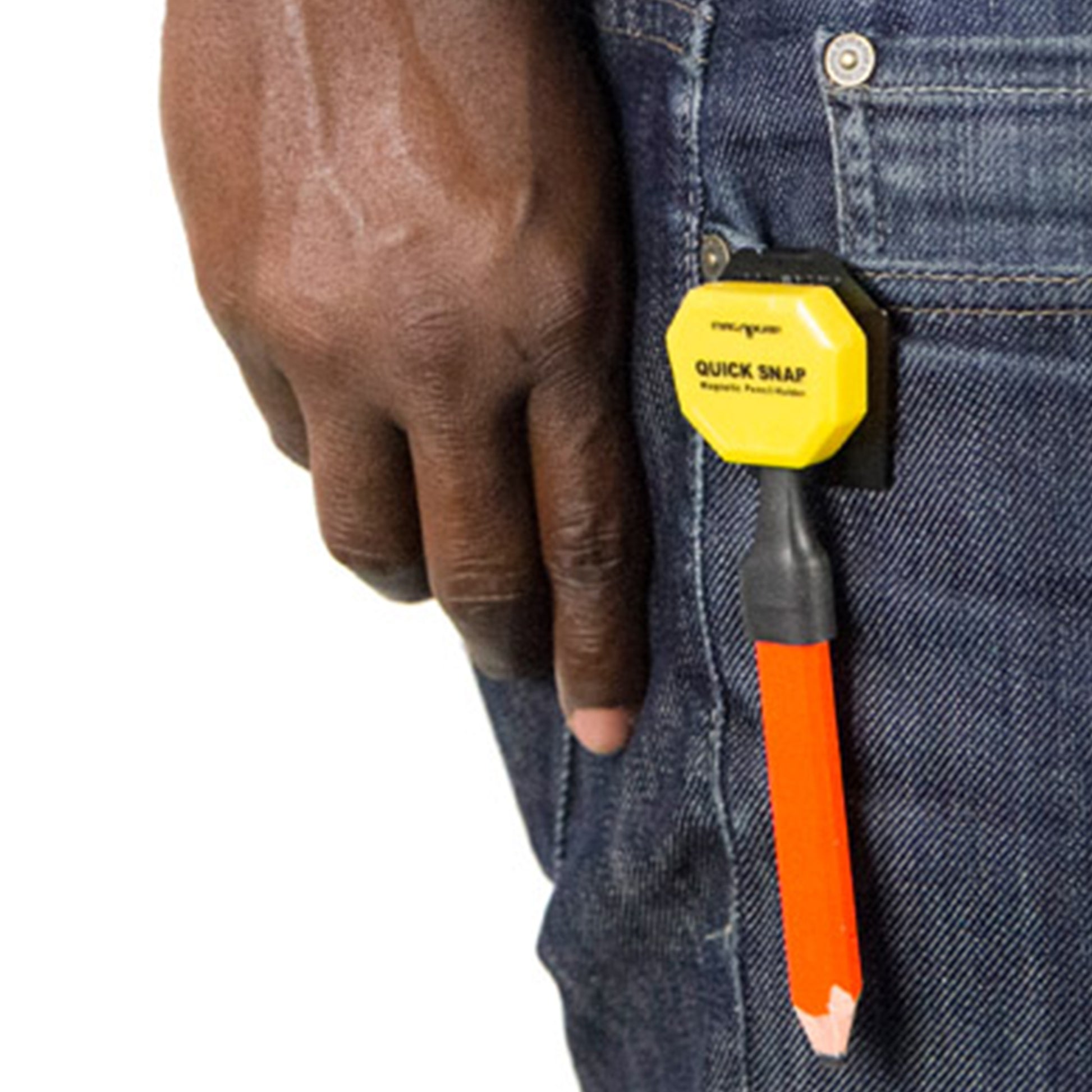 Use the Quick Snap Magnetic Pencil Holder with Belt Clip to get fast access to your favorite writing instrument while working. Holds carpenter pencils, grease pencils, pens and markers. Easily clips to pocket or belt for added convenience. Built-in magnet allows you to attach the pencil holder to any metal surface for convenient storage.